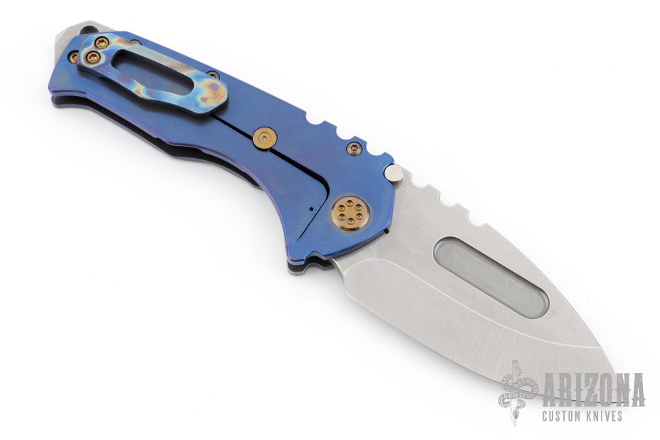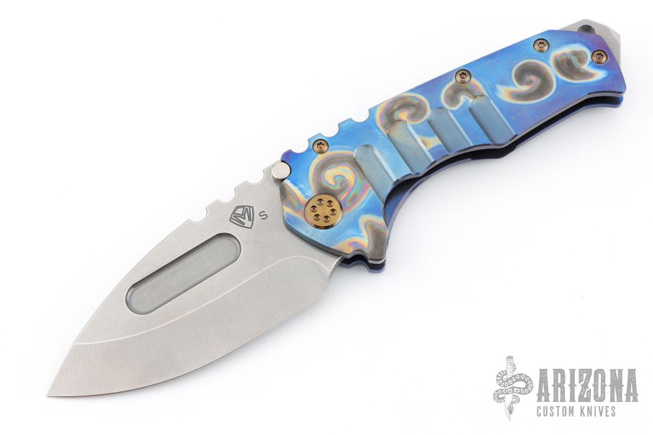 The Praetorian is a Marquee knife. It is a TON of blade in a relatively small package. This design incorporates aerospace materials, space age coatings, old school metallurgy, thoughtful design and hand craftsmanship that is rare but alive and strong in this modern world. This knife features a tumble finished drop point tanto blade. This particular knife features an anodized finished titanium frame, slender titanium scales, all titanium hardware, and titanium clip. Comes with original hard case, original box and papers. Excellent condition.
