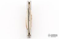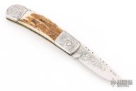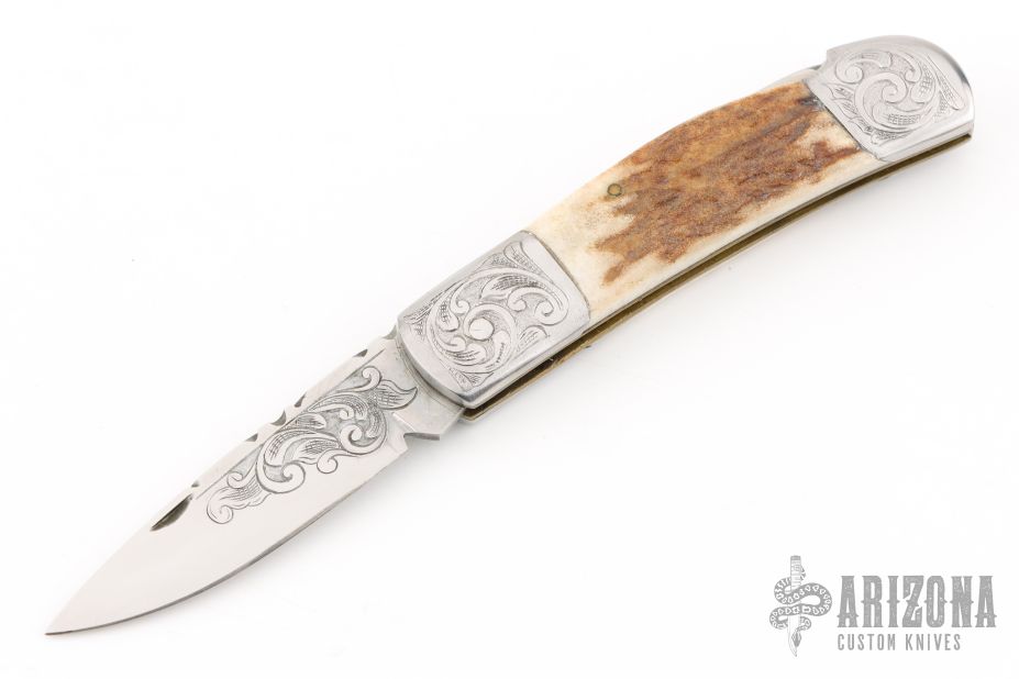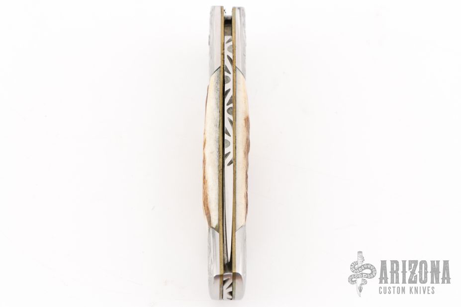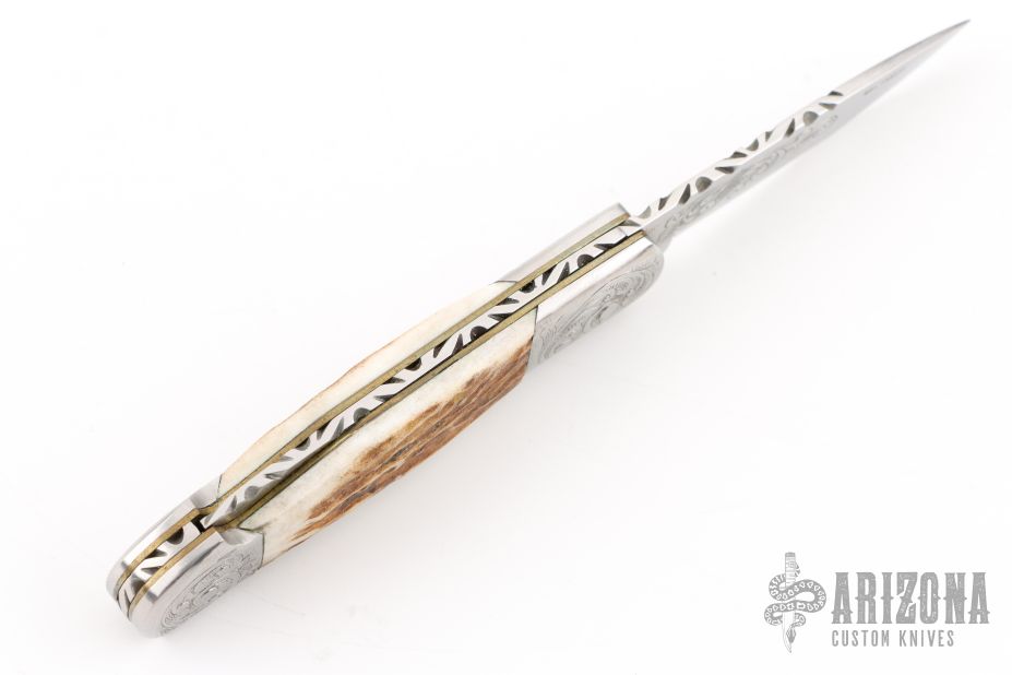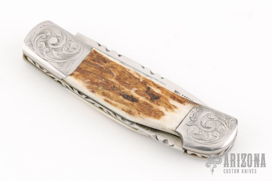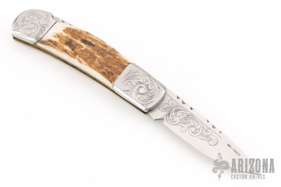 This lockback folder by Mel Fassio features a hand-rubbed satin finish blade with engraving, nail nick and fileworked spine. The handle has dovetailed engraved stainless bolsters, brass liners, fileworked stainless steel backspacer and stag scales. Comes with a leather slip sheath. Has some scratches, otherwise good condition.