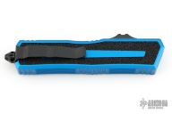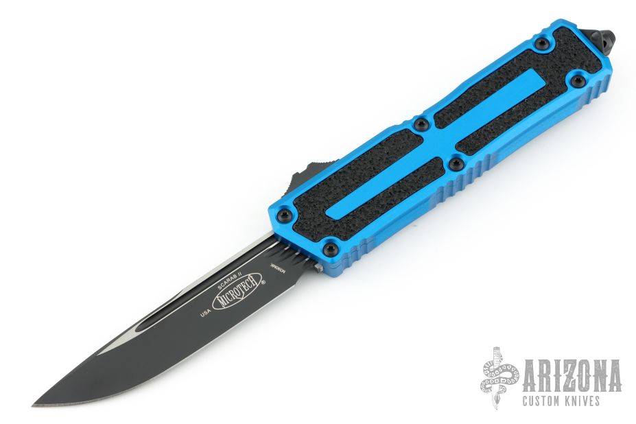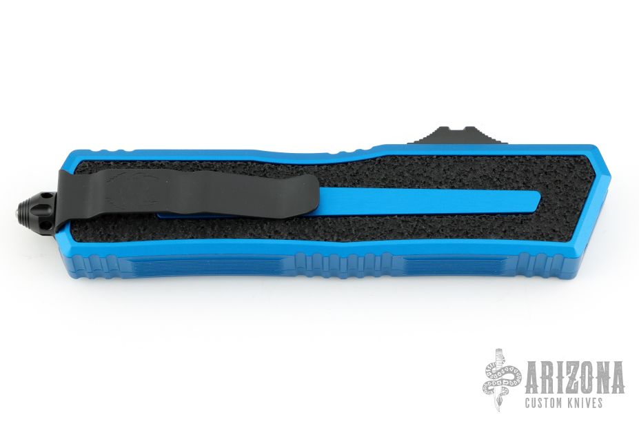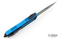 This Scarab II Gen III by Microtech features an apocalyptic finished blade with fullers. The handle has a blue aluminum handle with non-slip inserts, a single glass breaker and tip down stainless steel clip. Comes with original box and papers. Excellent condition.
