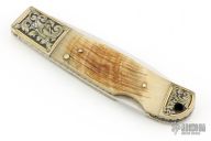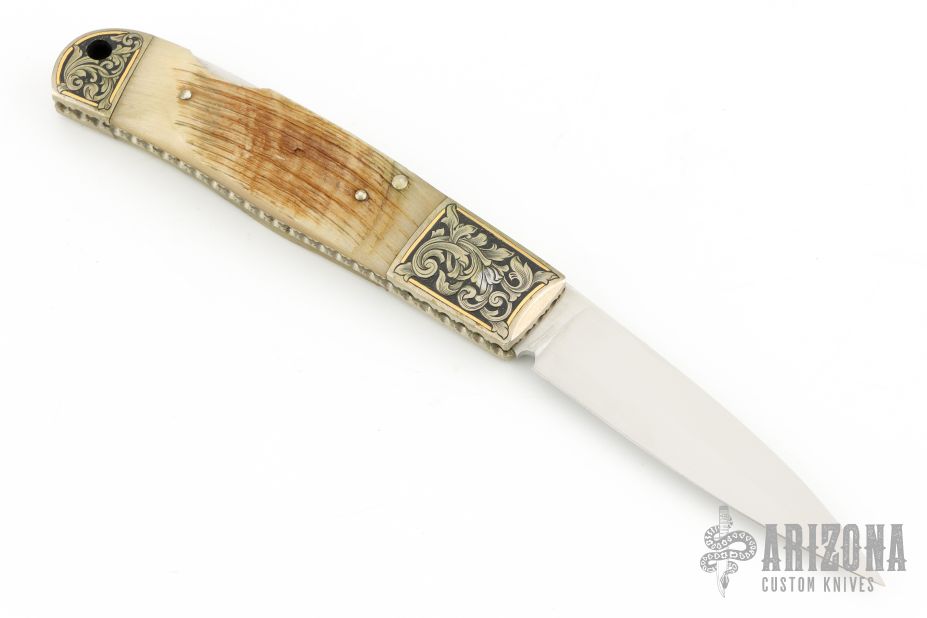 This Loveless Design Lockback by Frank Centofante features a hand rub satin finished drop point blade with nail nick. The handle has nickel silver double bolsters and sheep horn scales over fileworked nickel silver liners, steel lockbar and micarta backspacer. The bolsters have been engraved and have 24k gold inlays. Comes with a leather slip sheath. Nice lockup and blade seating. Has some light scratches, otherwise excellent condition.