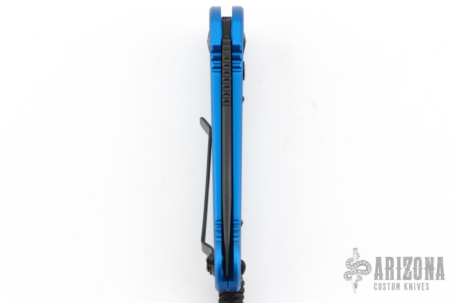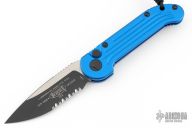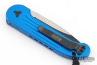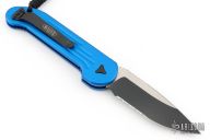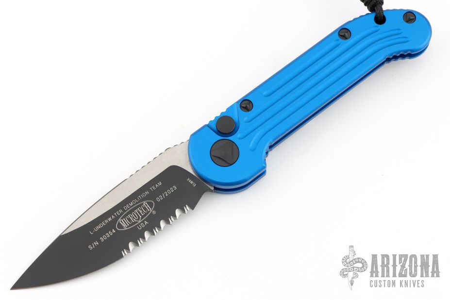 This LUDT auto by Microtech Knives has a black blade with a partially serrated edge and a blue aluminum frame with all black hardware. Stainless steel clip. Dated 02/2023 and serial number 30354. Comes with original box and papers. Excellent condition.