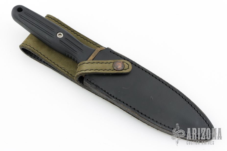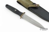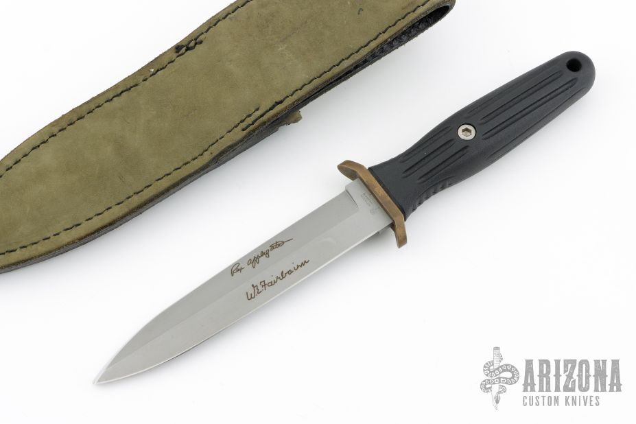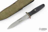 This version is smaller than the original and features a concave back blade. Based on an ancient Japanese spear design, this small and light boot knife is superior in penetration and slashing. When the retired Colonel Rex Applegate handed Boker the prints and design notes for the famous combat knife bearing his name and that of his partner, British Captain W.E. Fairbairn, Boker vowed to stay true to the genius of the original mode, stringently following the original design specifications, with allowances only for the latest in modern materials. The result is the perfect fusion of form and function: The Applegate-Fairbairn Fighting knife from Boker. Its history is compelling: During WWII, commando instructors Applegate and Fairbairn were both assigned to the OSS, the Office of Strategic Services, where they collaborated to improve the Fairbairn-Sykes commando knife, designed for serious hand to hand combat. Boker's reissue of the Applegate-Fairbairn Fighting knife uses the fiberglass-reinforced Delrin handle, thickened in the center for a sure grip. A lanyard hole adds convenience. The handle meets a short, forward bending cross guard that protects the fingers. Boker achieved the knife's preferred rearward balance by inserting lead weights into the handle--a beautifully ergonomic design. Struck of Solingen 440C stainless steel hardened to a Rockwell 58, the blade has the signatures of Rex Applegate and W.E. Fairbairn etched into the bead-blasted finish. Made in Germany. Comes with original leather sheath. Excellent condition. Has a "Besh Wedge" ground blade.