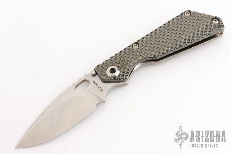 In 1988, he began making specialized knives for use by the military. This turned out to be fortunate turn of events, both for Mick and for the knife using world at large. Mick’s approach was to not get burdened by the weight of past designs. He started with a tabula rasa, a clean slate, informed only by his own experiences and knowledge of what a soldier needed in a knife. The knives he made didn’t look like the hunter-inspired knives seen in most PXs; instead they were almost brutish in their functionality: beefy, solid, and with unbreakable ¼” stock full tangs. These knives were the first indication of his innovative approach: in addition to their utilitarian design, the knives carried a subdued finish and subdued sheaths. No one carrying a Strider knife was going to be spotted because of sunlight glinting off of polished steel or a glossy leather sheath. Soldiers, policemen, and other men going into harm’s way couldn’t buy them fast enough. Mick sampled some good ideas, but made them great. For instance, he was not the first to wrap a knife handle with paracord, but he was the first to do it in a way that was tough enough for sustained infantry use. His knife line grew over the following years to include different varieties of fixed blades, all distinctive and many with specialized uses. But constant in all of them was a disregard for convention, and a desire to try new ideas. An example of this was the Ajax – it featured a very wide blade surface clearly designed to inflict damage. It drew on the weapons carried by Roman legionnaires, yet was modern and usable in the 21stCentury battlefield. Mick also worked on his technical skills, always striving to become better at the physical craft. At the 2002 Blade Show, a group of the best tactical knifemakers in the country decided to compete with each other to produce the most innovative and interesting fixed “battle blade” at the show. Mick’s entry, an incredible integral knife made out of ½” titanium stock with a zippered composite blade, gorgeous handles, and integral guard was the unanimous winner, and effectively retired the competition.