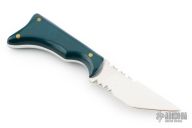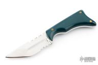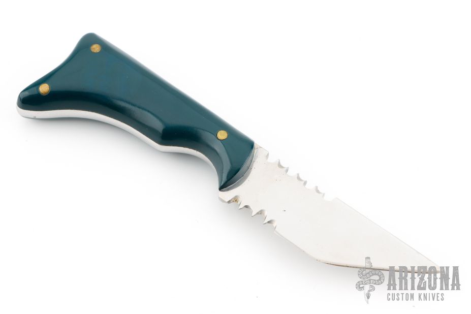 This fixed blade from Alex Collins features a polished partially serrated blade and notched thumbrest, .160" blade stock and .818" blade depth, full tang construction. The handle has blue/green scales with brass pins. Signed and dated on the tang, 1994. Has some light scuffs and scratches, great condition otherwise.