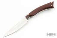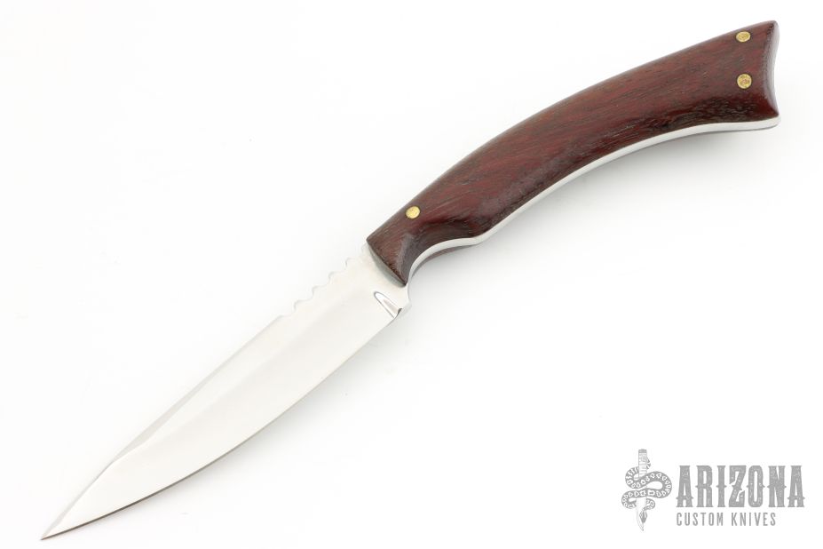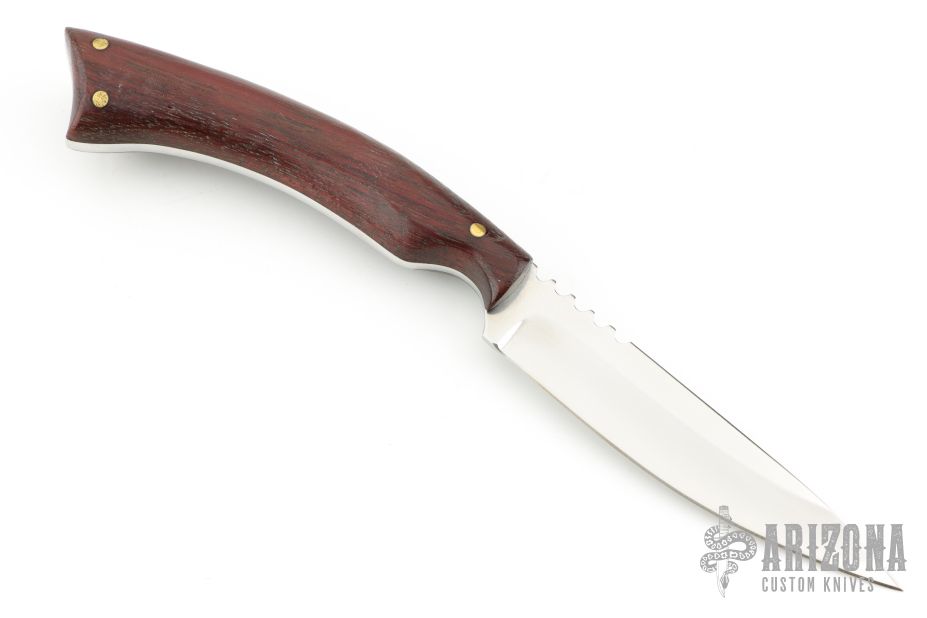 This fixed blade from Alex Collins features a polished blade with notched thumbrest, .125" blade stock and .747" blade depth, full tang construction. The handle has wood scales with brass pins. Signed and dated on the tang, 1993. Has a couple light scratches, otherwise excellent condition.