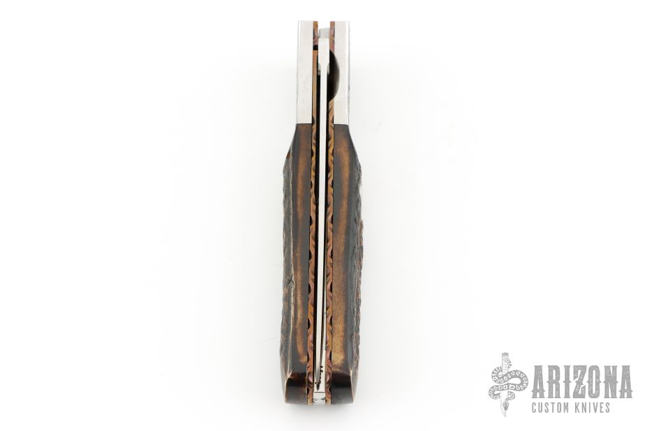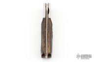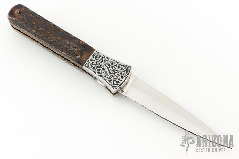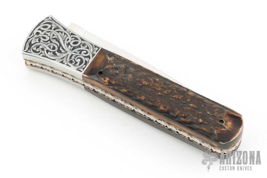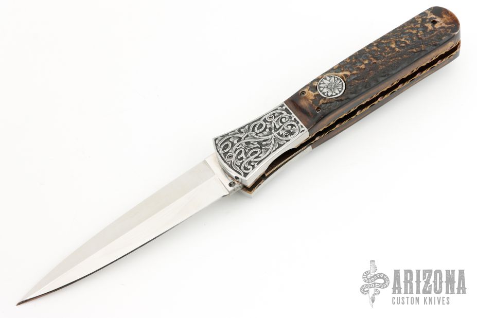 This Auto by Afaaq Custom Knives features a mirror polished blade with a false top edge. The handle has engraved stainless steel bolsters, fileworked and anodized titanium liners, stag scales, fileworked stainless steel backspacer. Comes with a leather case. New from maker!