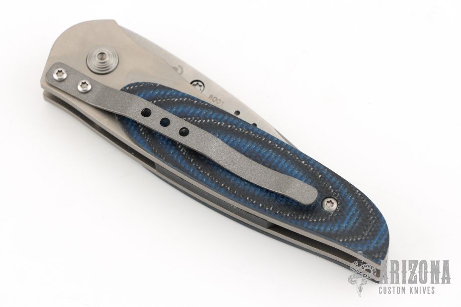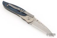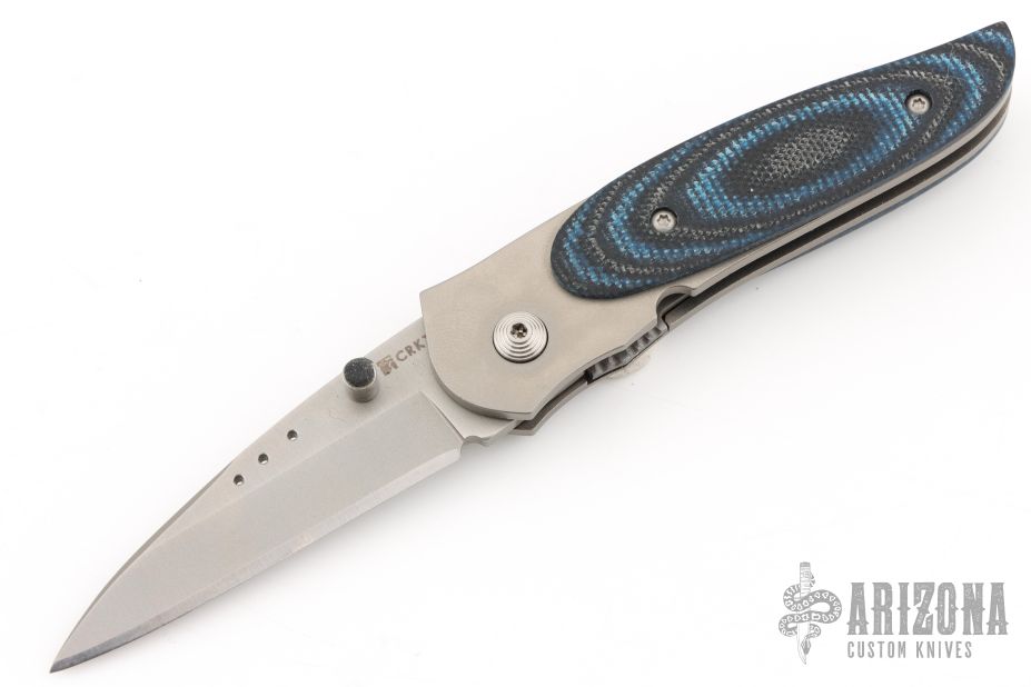 This Viele Wasp by Columbia River Knife and Tool is a Howard Viele design, it features black/blue G-10 scales over a bead blasted titanium frame . Single thumb stud with rubber inlay. Strong lock up, nice detent and blade seating is dead center. Excellent condition.