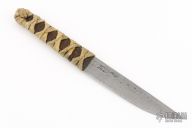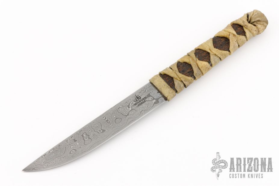 This Kwaiken by Master Smith Aaron Wilburn features a Damascus blade with .161" blade stock and .954" blade depth, hidden tang construction. The handle has a raw hide wrap over brown leather. #824 on the blade. Comes with a brown leather sheath with matching number. New from maker!