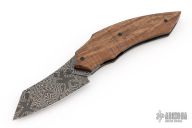 This linerlock front flipper by Florian Dreyer features a Mosaic Damascus blade with notched thumbrest and front flipper. The handle has curly koa wood scales, black titanium liners, blasted titanium backspacer. Rides on ceramic bearings, nice detent, lockup and blade seating. Comes with a zippered case and COA. New from maker.