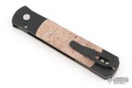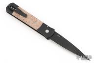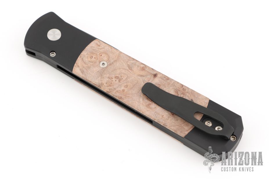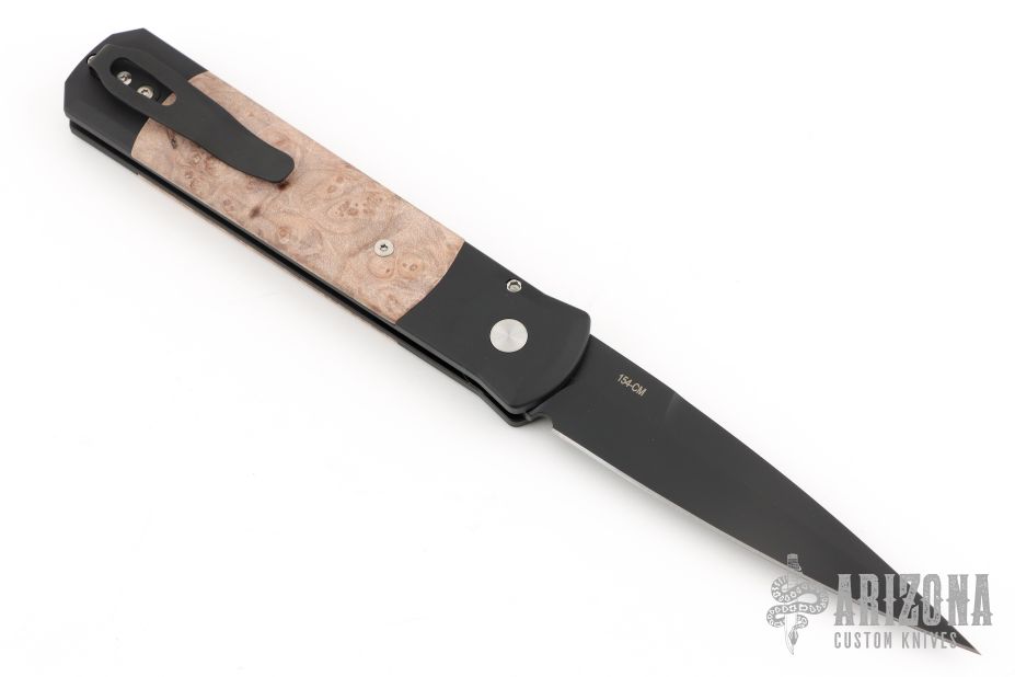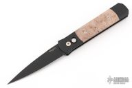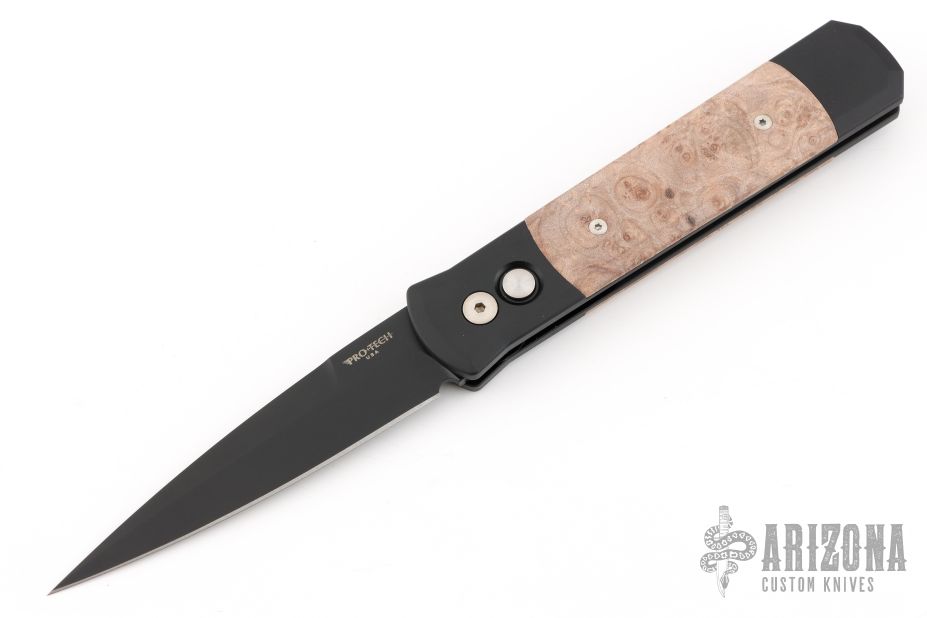 The Godfather 4" blade auto knife represents the influence of original Italian "Stilletto" style auto knife and Pro-Tech's modern coil spring precision. This Godfather has a DLC Black blade and anodized black handle with maple burl inlays. Black coated stainless steel clip. Comes with original box and papers. New from Maker!