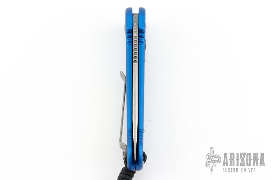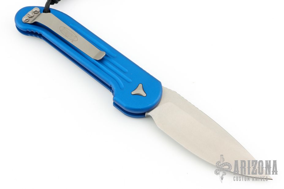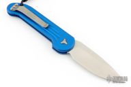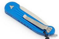 This LUDT side opening automatic by Microtech has a stonewash finished blade with a standard edge and a blue aluminum frame. Stainless steel clip. Dated 11/2015 and serial number 00569. Comes with original box and papers. Excellent condition.