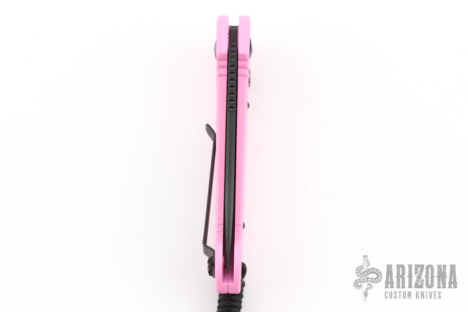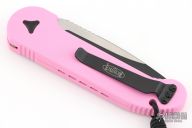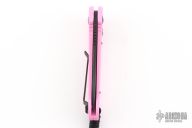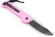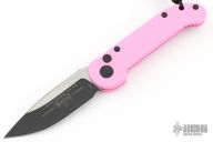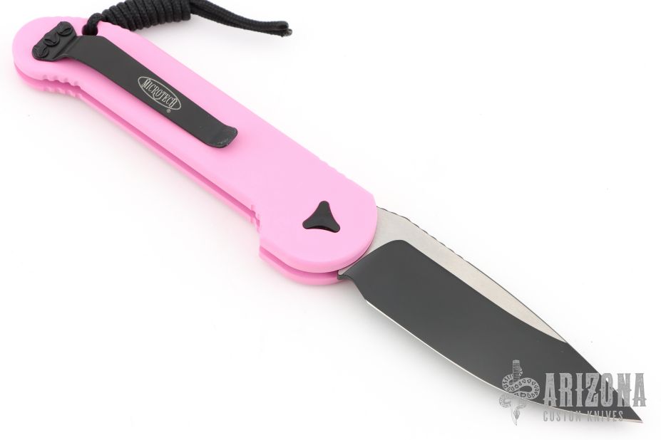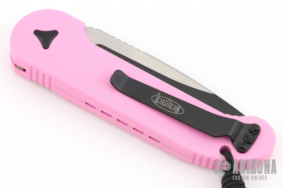 This LUDT side opening automatic by Microtech has a two-tone finished blade with a standard edge and a smooth pink aluminum frame. Stainless steel clip. Serial number 345367 Dated 09/23. Comes with original box and papers. Excellent condition.