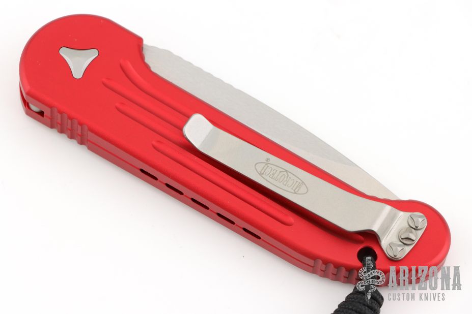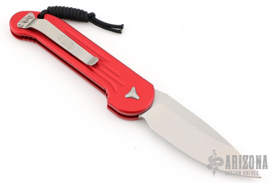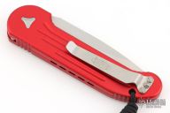 This LUDT auto by Microtech Knives has a stonewash finish blade with a standard edge and a red aluminum frame with a stainless steel clip. Dated 03/2023 and serial number 30844. Comes with original box, and papers. Excellent condition.