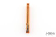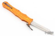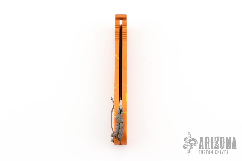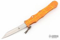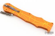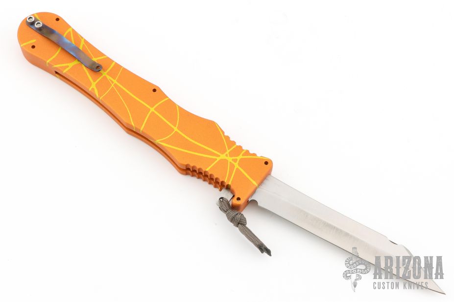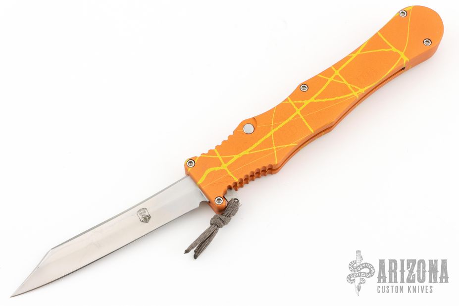 This Mayhem OTF by Rob Dalton features a satin finished upswept wharncliffe blade. The handle is orange/yellow anodized aluminum with charging tab. Comes with box. Has some light scuffs and scratches, great condition otherwise. This color pattern is supposed to be the rarest of the Mayhem models, this is the second one we have had.