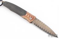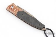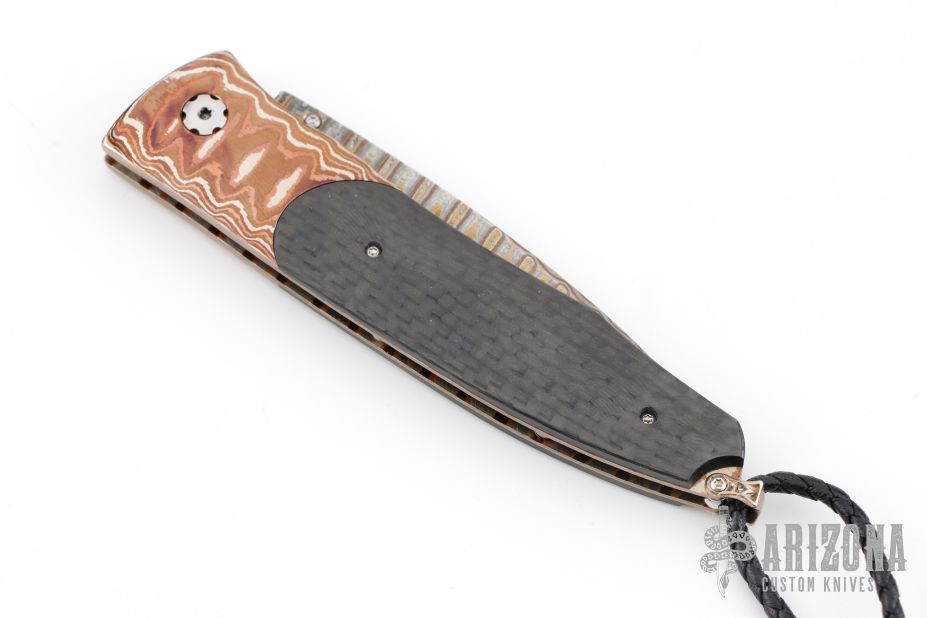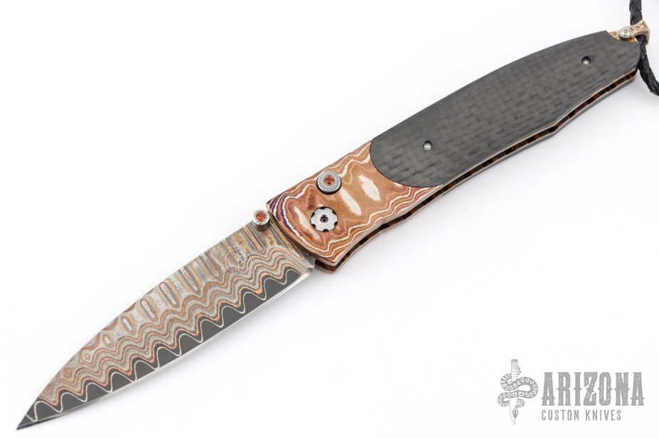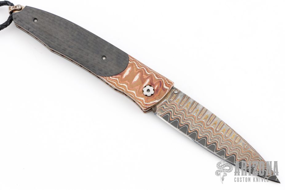This B30 Dark Fire by William Henry features a "Copper Wave" Damascus blade with VG5 core single with citrine inset in gold bezel. The handle has heat colored "wave" mokume frame with carbon fiber inlays. Has button release with citrine stone inlaid in a gold bezel. Includes certificate of authenticity dated January 27, 2022 and original box, sheath and papers. Excellent condition.