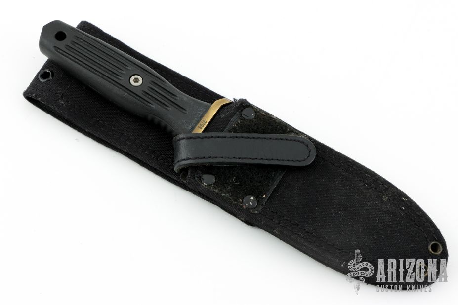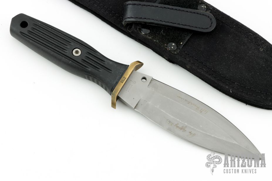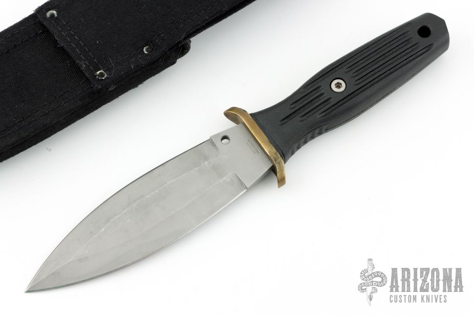 This Applegate -Fairbairn Mini Smatchet by Boker Knives has a bead blasted double-edged spear point blade with .185" blade stock, 1.378" depth. The handle is comprised of a brass guard and black fiber spacer with black polymer handle over hidden tang construction. Lanyard hole in pommel. Includes nylon sheath with belt loop. Numbered 3708 on guard. Has some scuffs and scratches, otherwise good condition.