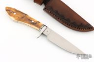 This Fixed Utility from Master Smith Terry Vandeventer has a hand rub satin finished blade with a visible temper line, .205" blade stock and 1.043" blade depth. The handle has a stainless steel guard, mammoth ivory covers, nickel silver frame, file-worked nickel silver spacer and pins. Includes leather sheath. Very nice work. Has some patina and a couple light scuffs. Excellent condition otherwise.