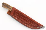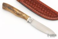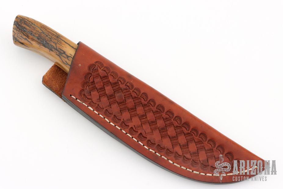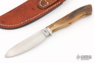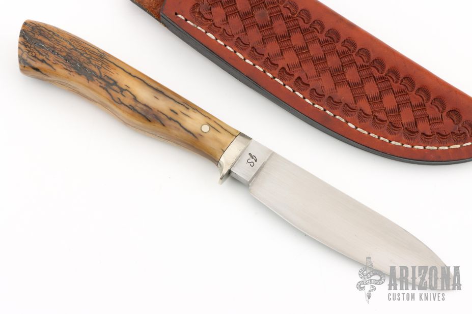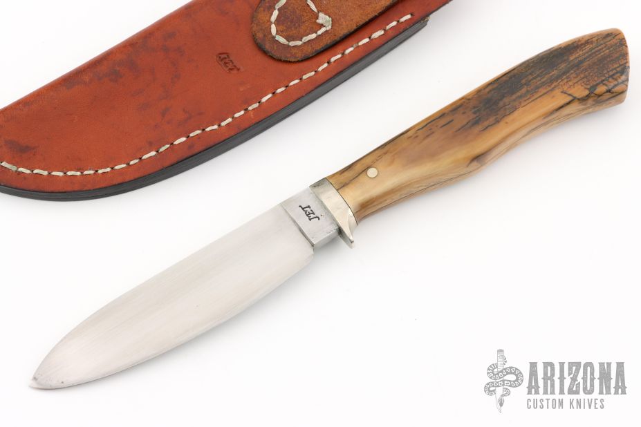 This knife by John E Tilton features a hand rub satin finished blade with visible temper line, .199" blade stock and .990" blade depth, hidden tang construction. The handle has a nickel silver guard, mammoth grip with single nickel silver pin. Comes with hand-tooled leather belt sheath. Has some scratches, and patina. Great condition otherwise.