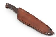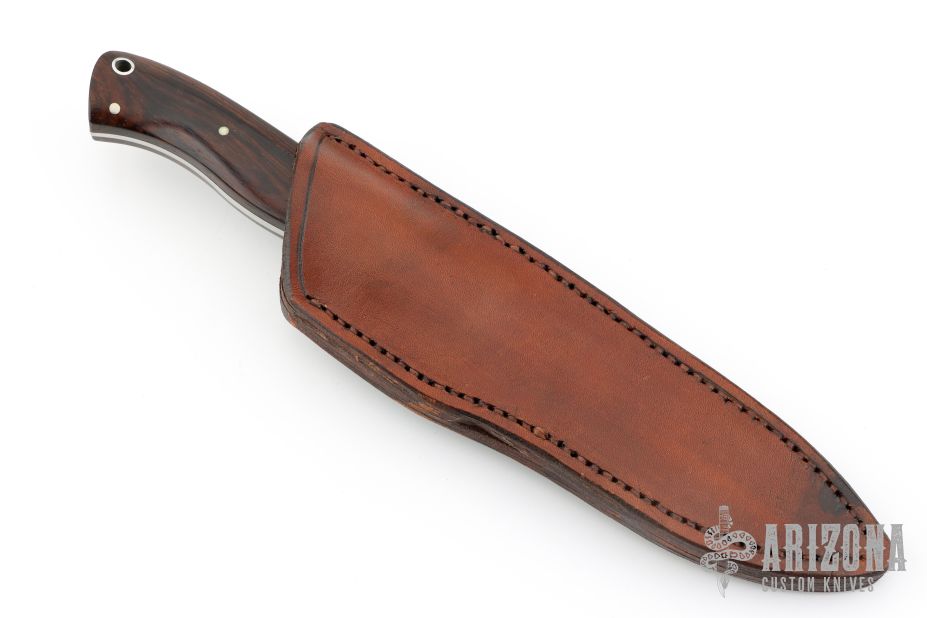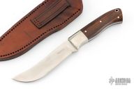 This knife by Mel Pardue features a satin finished blade with .156" blade stock and .982" blade depth, tapered tang construction. The handle has a nickel silver bolsters with pinned wood slabs. Comes with a brown leather sheath. Has a couple light scuffs, excellent condition otherwise.