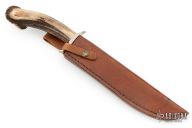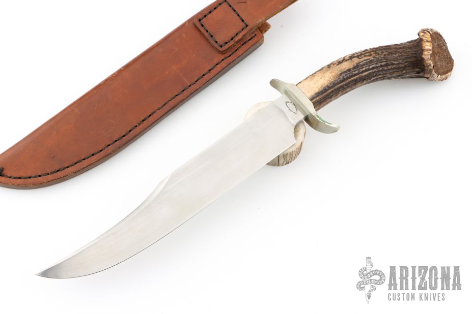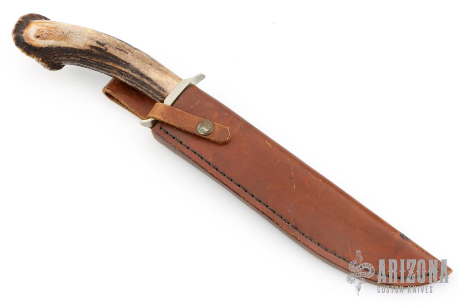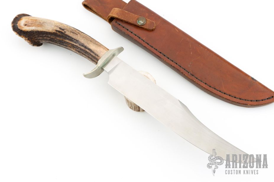 This bowie by David Broadwell features a PM234 hand rub satin finished clip point blade .238" blade stock and 1.45" blade depth, hidden tang construction. The handle has a nickel silver guard, crown stag grip with single pin. Comes with a brown leather sheath. Has some light scratches, scuffs and patina, otherwise great condition.
