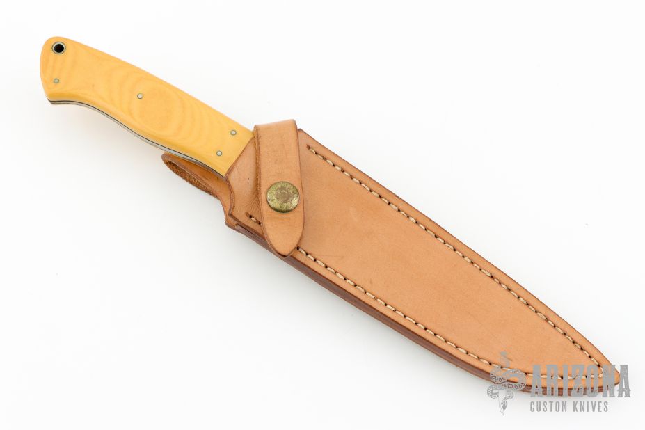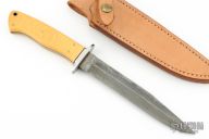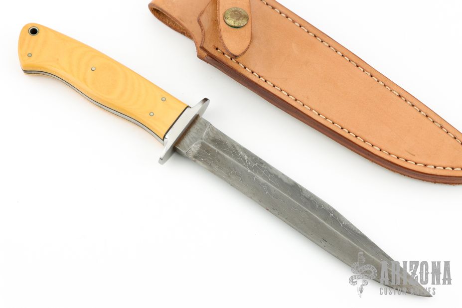 This fighter by Mike Sanders features a cable Damascus blade with false top edge, tapered tang construction, .248" blade stock and 1.017" depth. The handle features a stainless guard, black spacers, nicely contoured vintage paper micarta covers with scrimshaw and nickel silver pins. Lanyard hole in pommel. Scrimshaw done by Evelyn Sanders. Comes with leather belt sheath. Has some patina and light scratches, great condition otherwise.