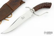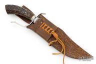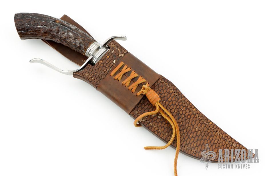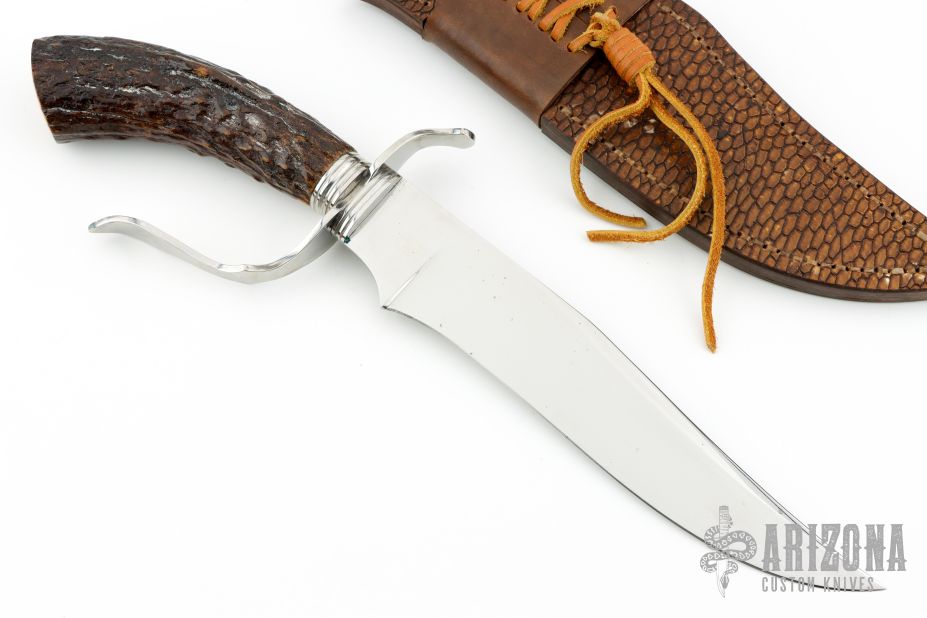 This Bowie/Fighter by Rocco Chicarilli features a mirror polished blade with a sharpened top edge, .156" blade stock and 1.71" blade depth, hidden tang construction. The handle has a stainless steel guard and collar, with stag grip. Very nice work. Comes with a brown leather sheath. Has a couple light scratches, otherwise excellent condition.