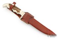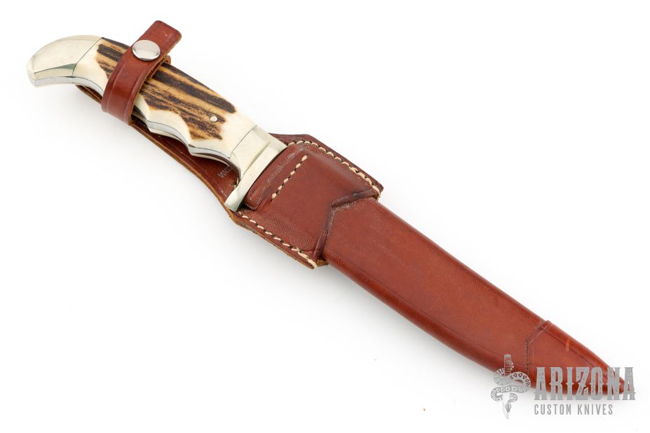 This Vintage Original Trapper Knife by Anton Wingen Jr features a satin finished blade with a sharpened top edge and notched thumbrest, .206" blade stock and 1.133" blade depth, full tang construction. The handle has a nickel silver guard and rear bolsters, stag scales brass pins. Comes with original brown leather sheath. Has some patina and scratches, otherwise excellent condition for its age.