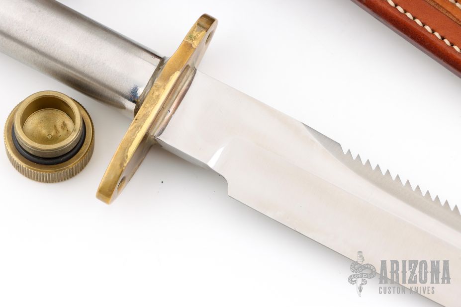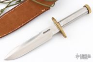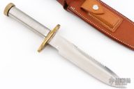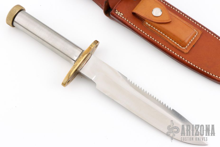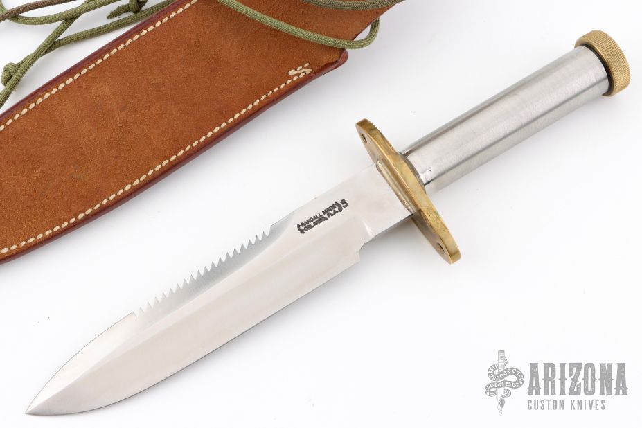 This Model 18-7.5 Attack Survival from Randall Made Knives has a spear point blade with a sharpened top edge with sawteeth, .230" blade stock and 1.428" blade depth, hidden tang construction. The handle has a brass guard and knurled and butt cap, smooth stainless steel handle. Comes with a rough back brown leather sheath. Has a few light scratches, otherwise excellent condition.