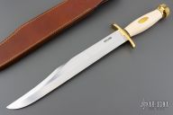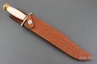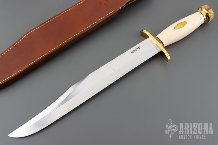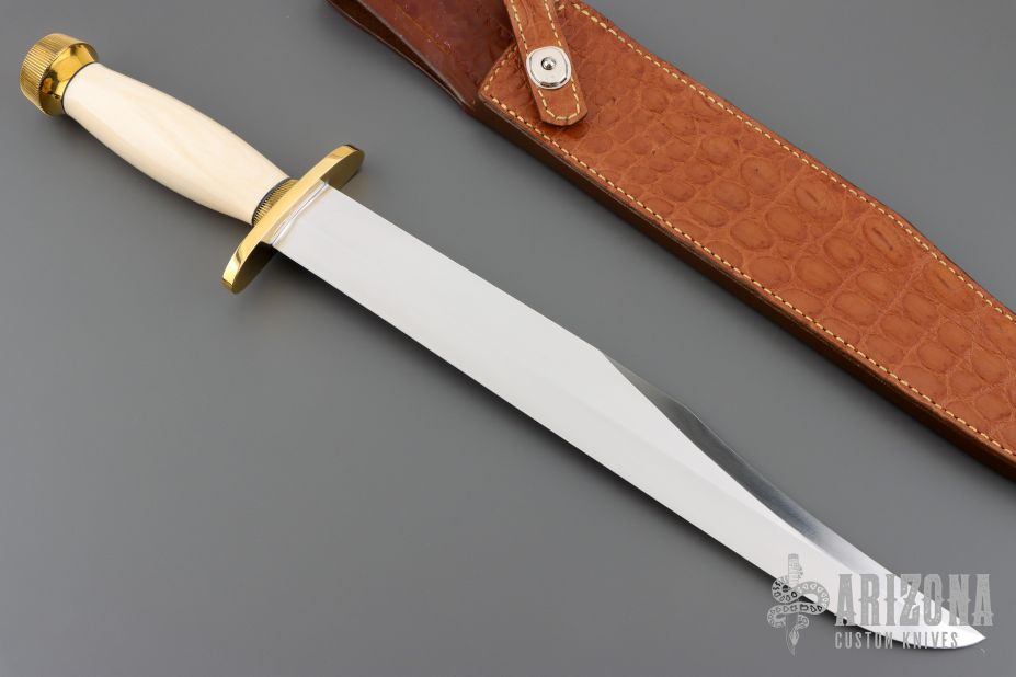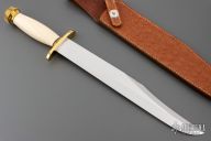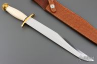 The 13" Randall Thorp Bowie by Randall Made Knives is similar to types used by Confederate troops. This one has an 13" carbon steel blade with sharpened top edge, .216" blade stock and 1.666" blade depth, hidden tang construction. The handle has a forward curved brass guard and scalloped butt cap, ivorite grip with brass esctucheon and black spacers. Comes with a brown leather sheath with Crocodile skin overlay by Treeman Leather Shop. Has some a few light scratches, otherwise excellent condition. Comes with a zippered case.