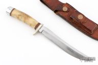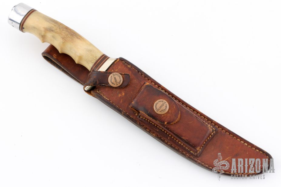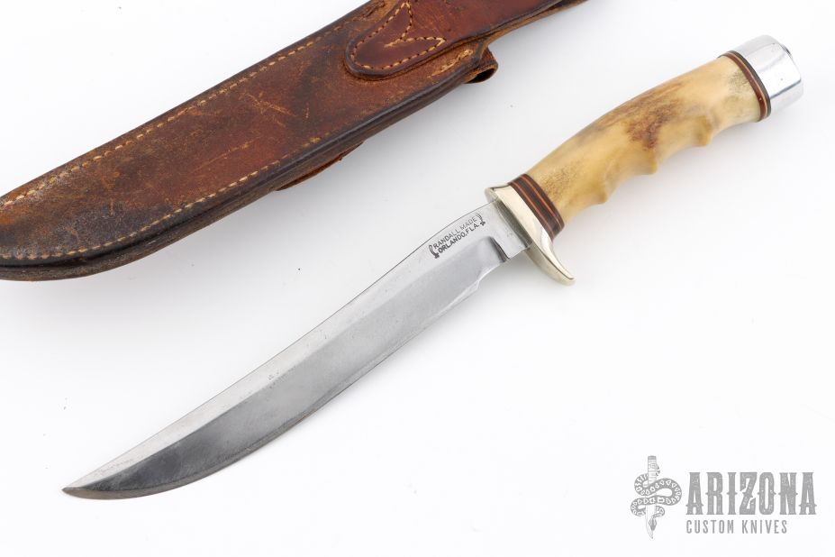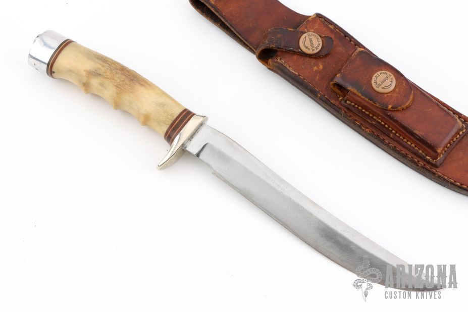 This model 3-7 by Randall Made Knives features a satin finished carbon steel blade with a false top edge, .220" blade stock and .965" blade depth, hidden tang construction. The handle has a nickel silver guard with a finger groove stag grip, 7 red/white/blue spacers, duralumin butt cap. Comes with a Heiser brown leather sheath with brown buttons. Comes with a zippered case. Has been used and resharpened, has scratches, otherwise good condition for its age.