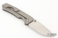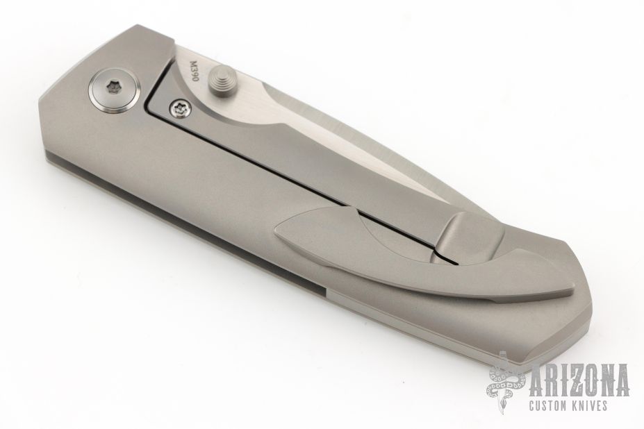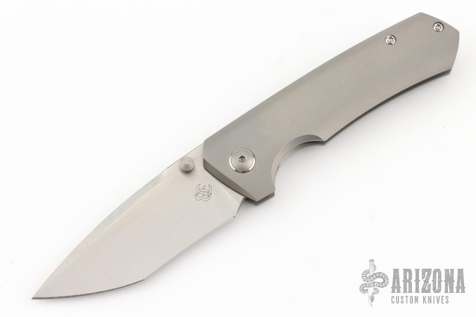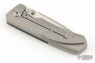 This Production Elder from Brian Efros features a drop point recurve blade with satin finish, and dual bead blasted thumbstuds. The handle is comprised of bead blast finished titanium and has a titanium clip positioned for tip up carry. Very nice action, detent, and blade seating. Comes with original box, and zipper case. Excellent condition.