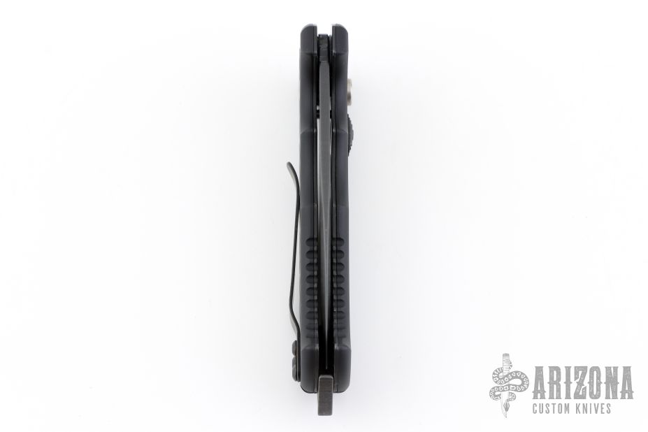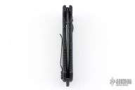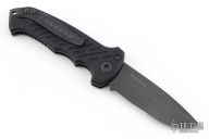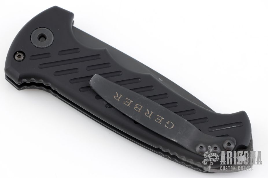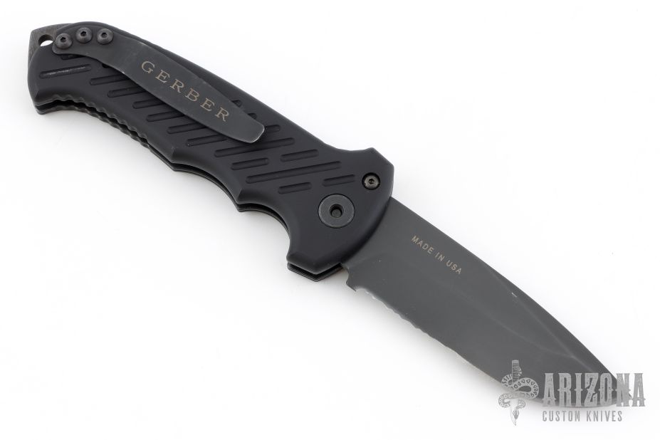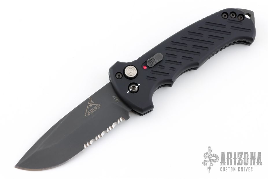 This 06 Side Opening Auto has a matte black finished S30V drop point blade with partial serrations. The handle is black aluminum over black stainless steel liners, exposed stainless steel tang butt/ glass breaker/ backspacer with lanyard hole, black stainless steel tip up (RH/LH reversible) clip, and safety button. Comes with original belt sheath. Has some light scuffs, has some white paint pen on the pivot showing that it was never taken apart? i'm not sure on that, otherwise excellent condition.