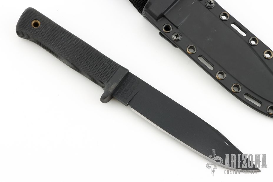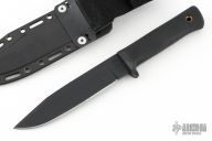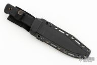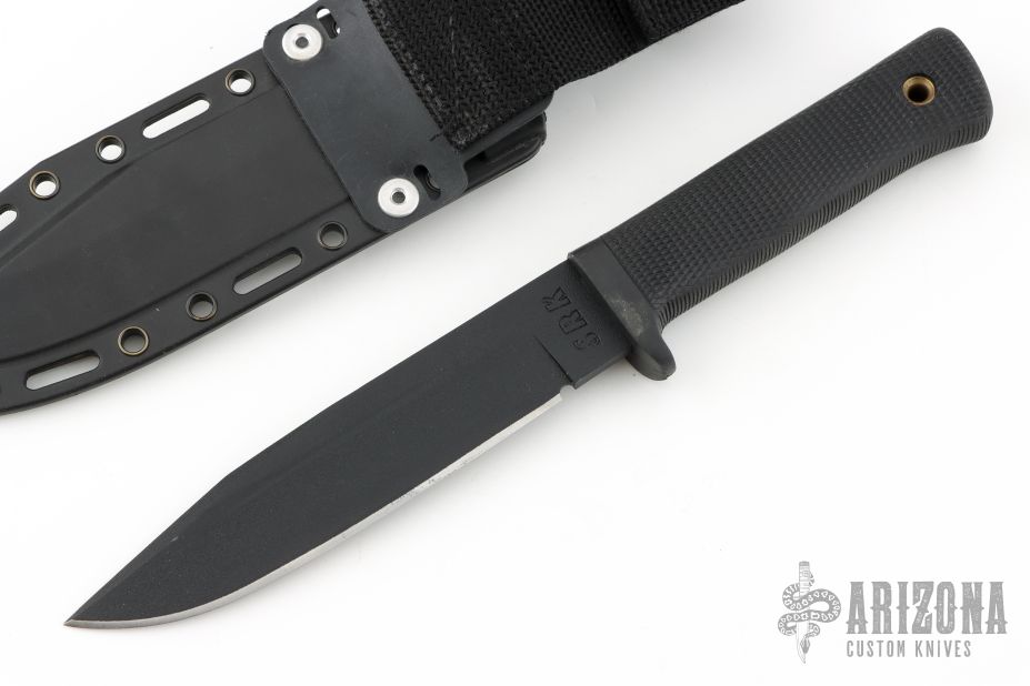 This Cold Steel SRK Utility Knife has a black carbon V steel clip point blade with .216" blade stock and 1.229" blade depth, hidden tang construction. Handle is black non-slip with single guard and lanyard hole. Comes with black sheath with belt loop. Has some sheath scuffs, otherwise excellent condition.