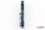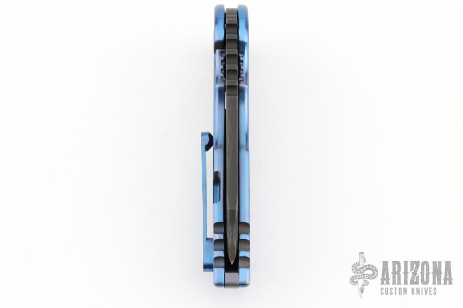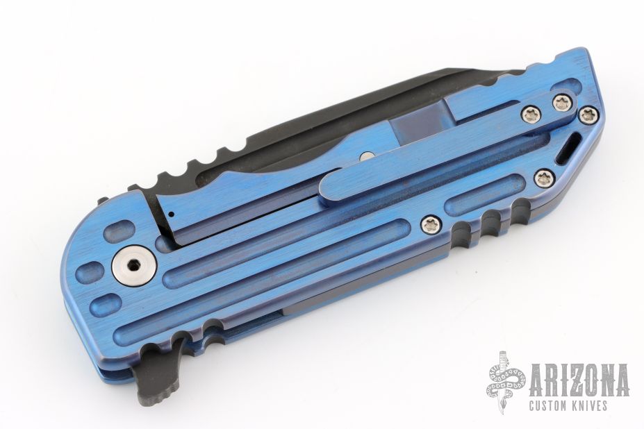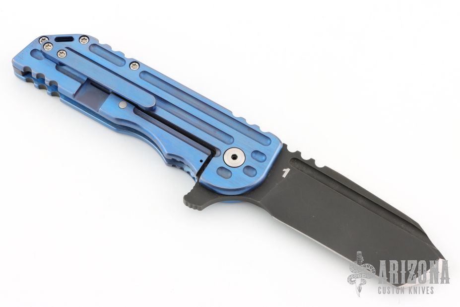 This Warhorse features a black finished blade with fullers that opens/closes effortlessly on caged bearings. The handle is titanium with an anodized finish, and matching titanium clip/backspacer. The blade is centered when closed and locks up with no play. Has some scuffs and scratches, great condition otherwise.