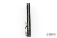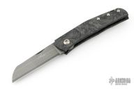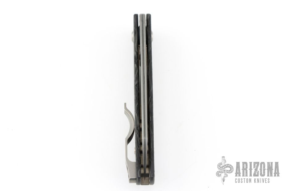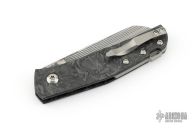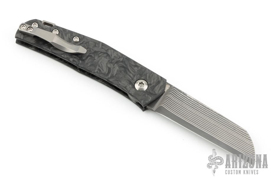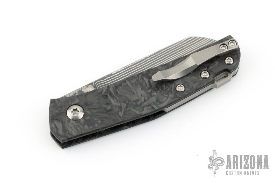 This Monte Carlo by Jens Anso features Takefu San Mai Damascus sheepsfoot style blade with nail nick. The handle has marbled carbon fiber scales over dual inlaid liners with double detent that provides a crisp click in the open, closed and half stop positions. Blasted titanium backspacer with lanyard bail and machined tip up clip. Includes original box and COA dated February 15th, 2025 and #731. Excellent condition.