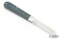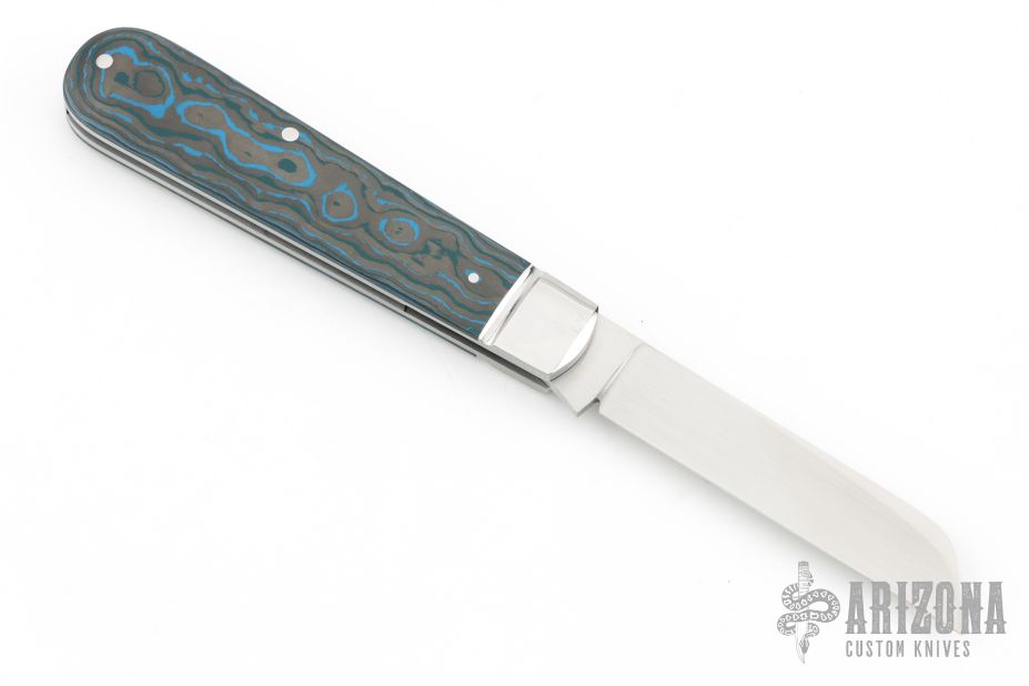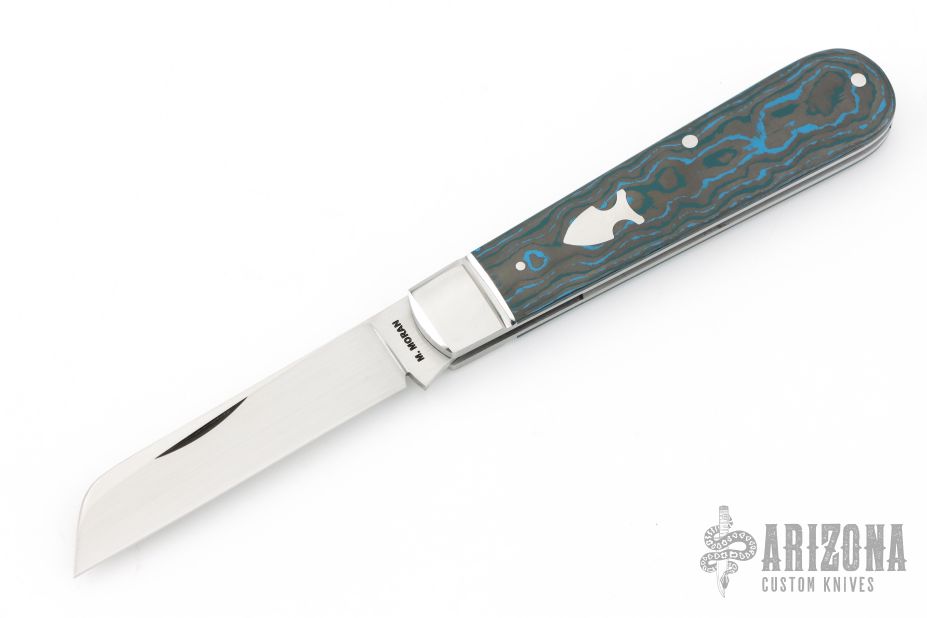 This slipjoint from Mike Moran features a hand rub satin finished wharncliffe blade with nail nick. The handle has fluted stainless steel bolsters, Arctic Storm Fat Carbon covers with a stainless steel escutcheon, stainless steel liners, stainless steel spring. Spring is flush in the closed, half stop, and open position. Nice blade seating and function. Excellent condition. Comes with zippered case and COA dated 5-14-24.