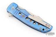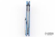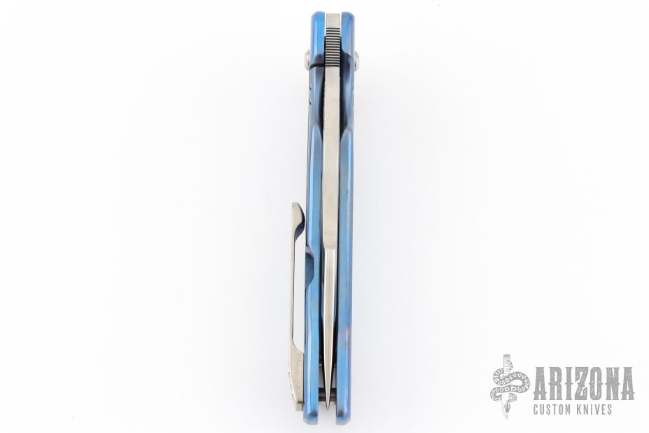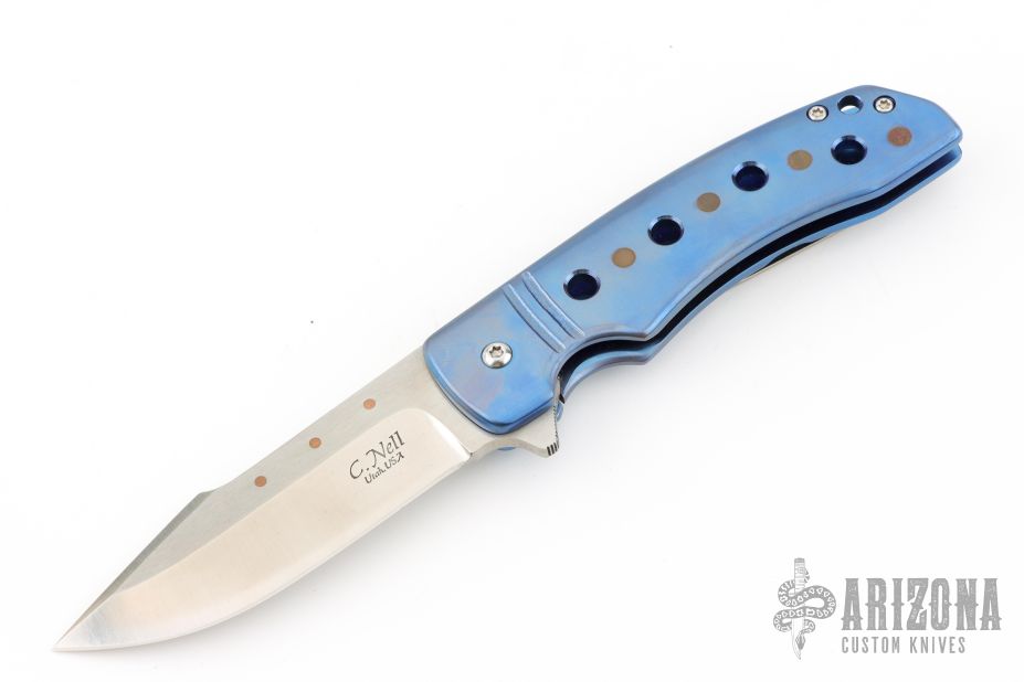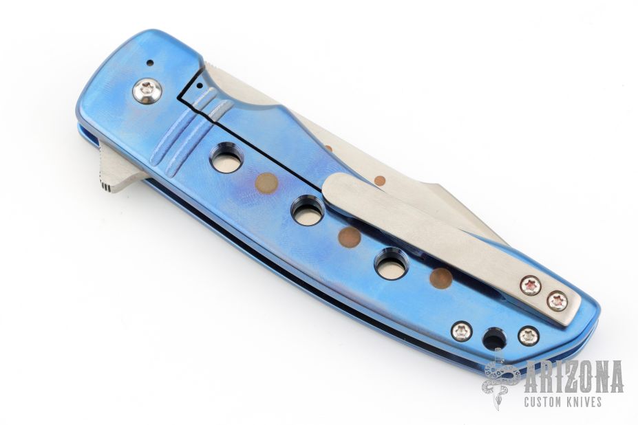 This ESG Framelock flipper by Chad Nell has a satin finished blade with flipper tab, notched thumb rest, swedge, copper insets. Handle has an anodized titanium frame with matching titanium tip up clip and copper accents. Nice detent, lockup and blade seating. Comes in a soft pouch. Has a couple light scuffs, excellent condition otherwise.