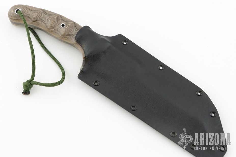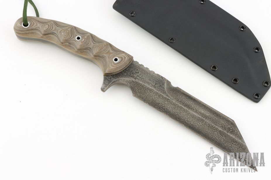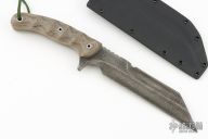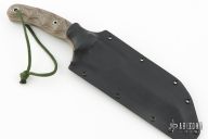 This Battle Bear by Fallen Oak Forge features a wharncliffe blade with notched thumbrest and a sharpened top edge, .263" blade stock and 1.391" blade depth, full tang construction. The handle has paper micarta scales with hollow pins and a lanyard hole. Comes with a kydex sheath. Excellent condition.