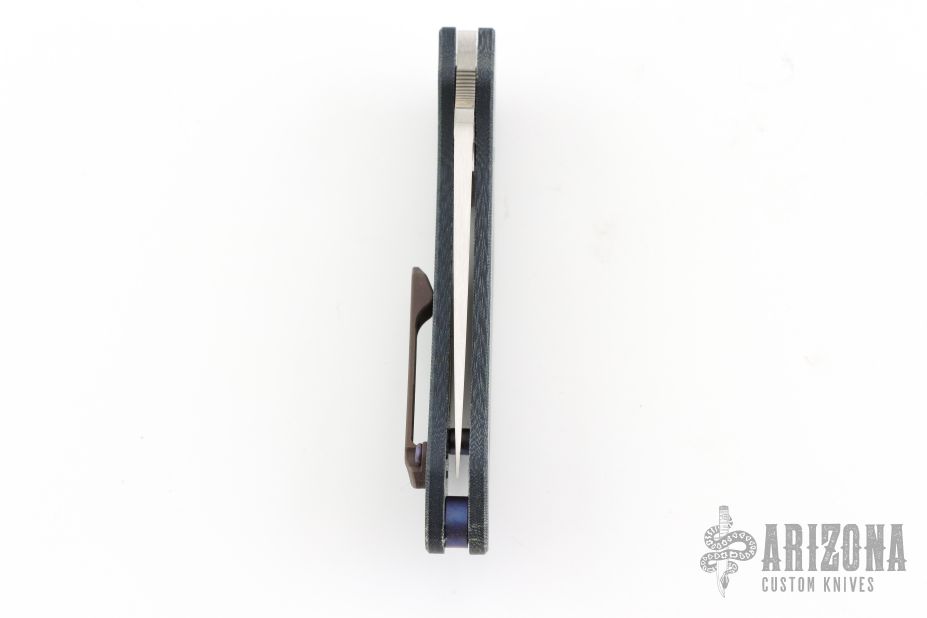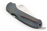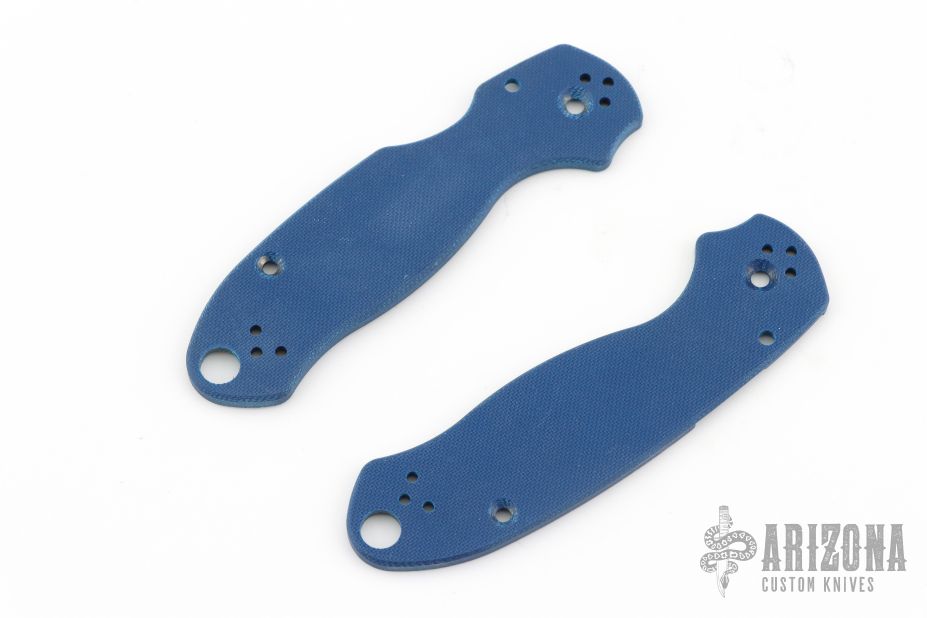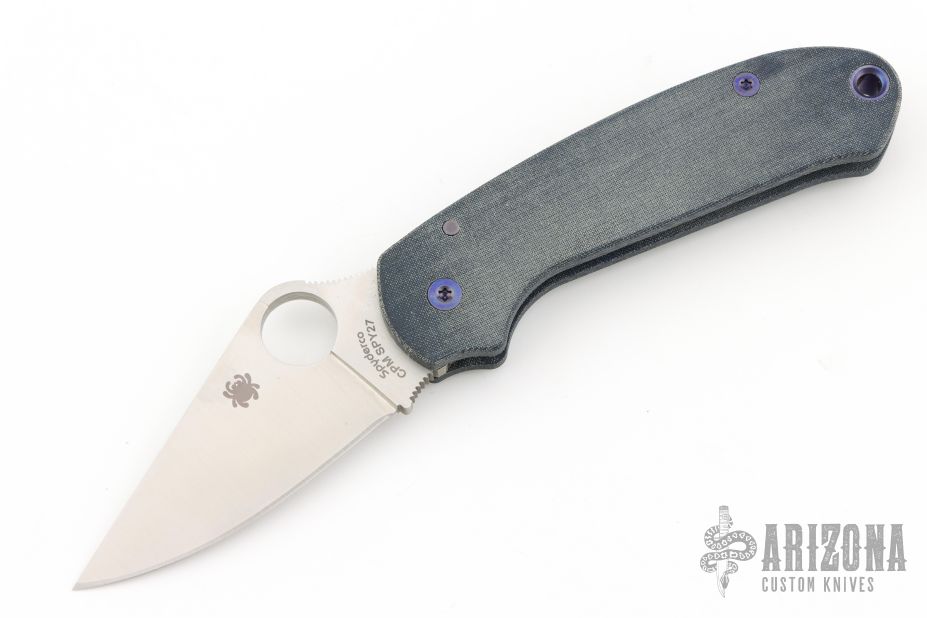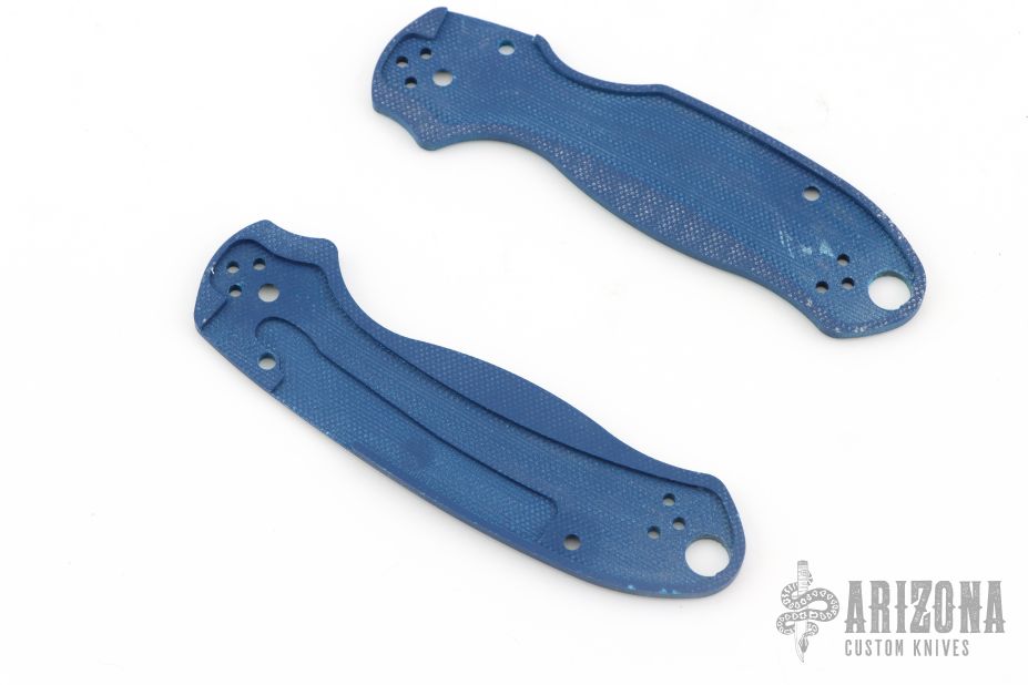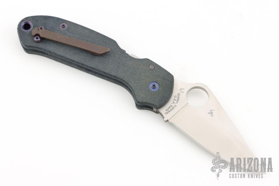 This Paramilitary 3 from Spyderco has a satin finished clip point blade with thumb hole and notched thumb rest. Handle has RGT blue micarta scales with tip up titanium clip. Comes with original box, papers, blue g10 scales, clip, and hardware. There are some light scratches on the clip, otherwise the knife is in Excellent condition.