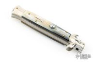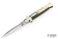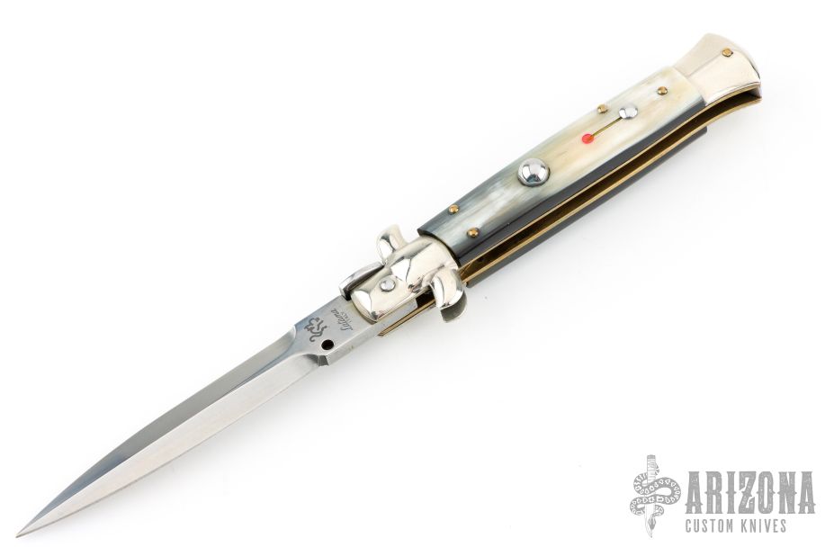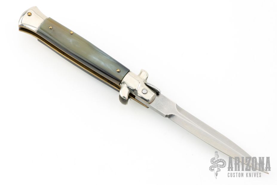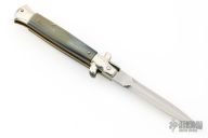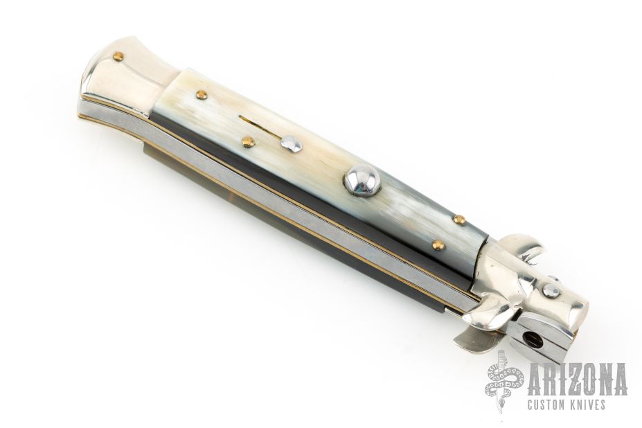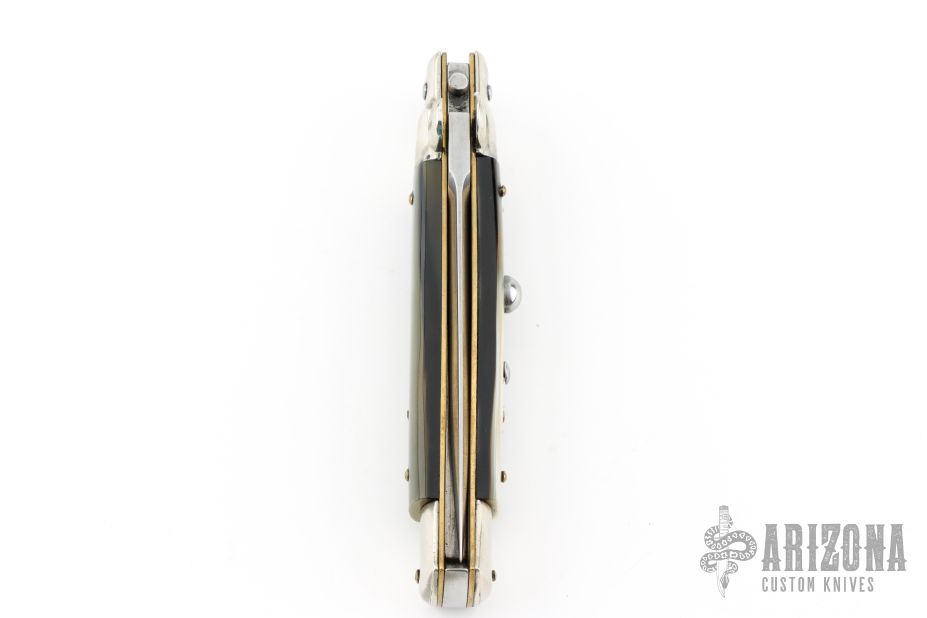 This swivel bolster auto by Latama features a spear point blade with a false top edge. Nickel silver guard and rear bolster and White/Black Brazilian horn scales, brass liners and stainless steel backspacer. Nice function, strong firing and lock up. Excellent condition.