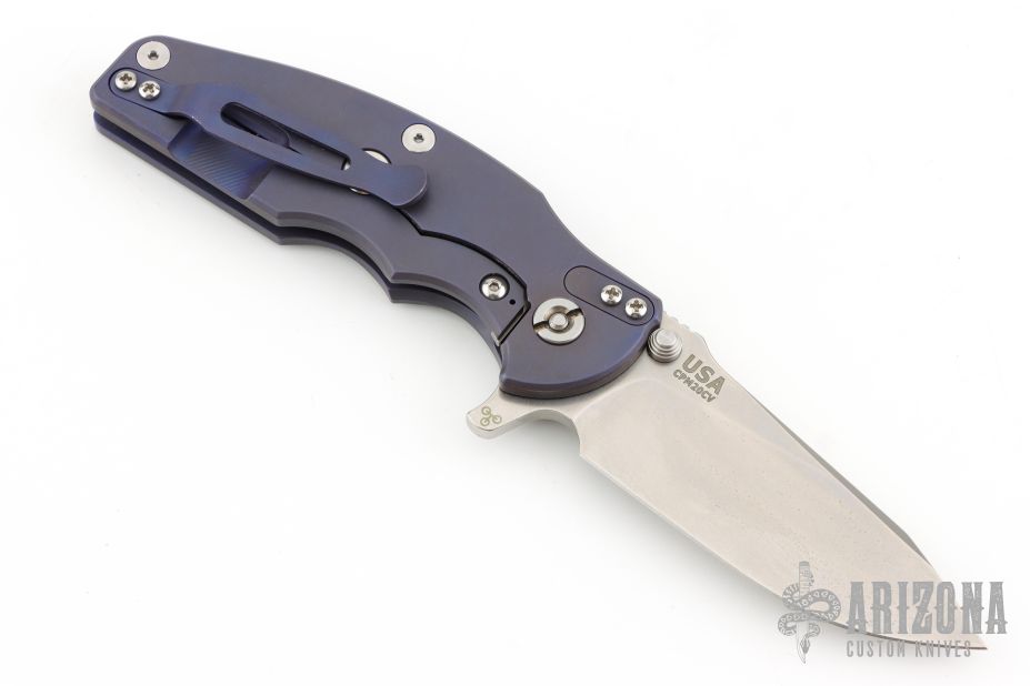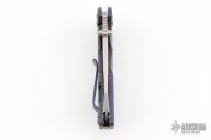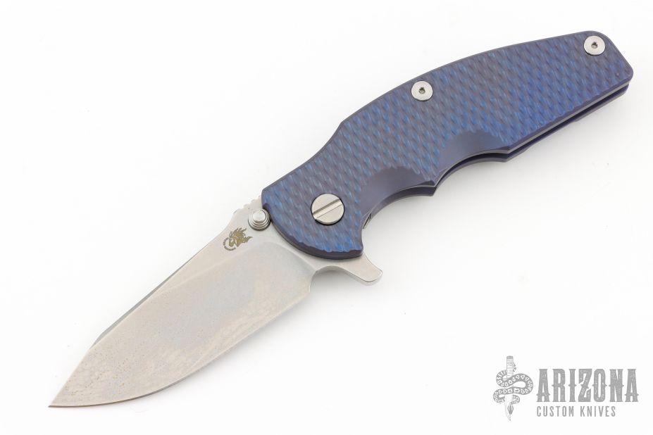 This Jurassic by Hinderer Knives features a stonewashed, drop point blade with notched thumbrest and flipper. The handle has an anodized/stonewashed titanium frame with, tip up or down reversible clip and a modular backspacer. Nice detent, lockup and blade seating. This knife has the Tri-Way pivot system. Comes with original box, blue g10 covers, and extra washers. Excellent condition.