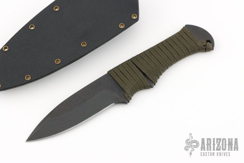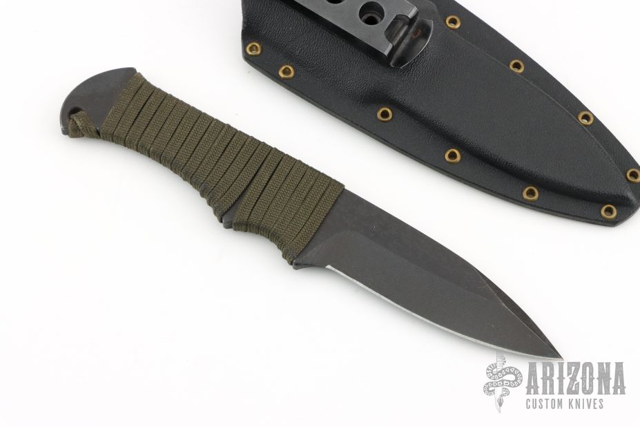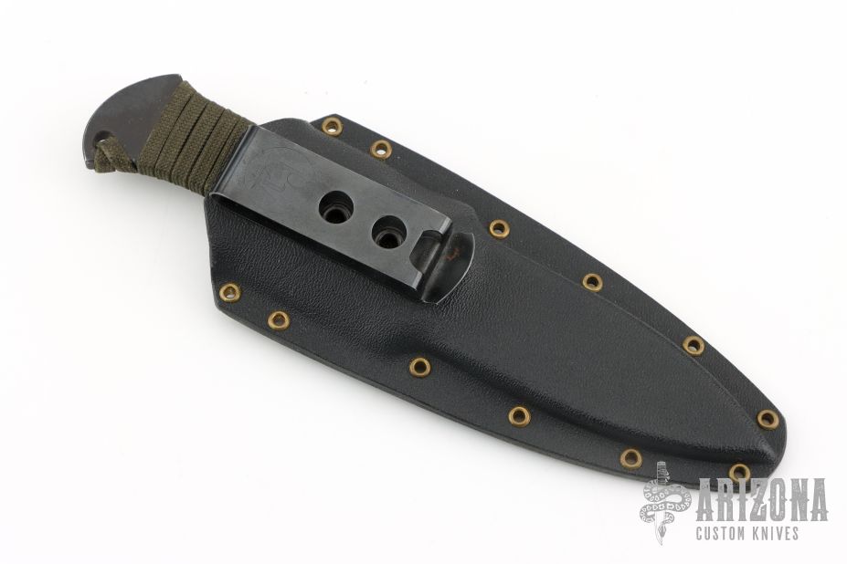 This Blood Shark by Tracker Dan features a black blade with .184" blade stock and .997" blade depth. The handle has flat paracord wrap. Comes with a kydex sheath and the knife will fit in either direction. Has a couple light scuffs, otherwise excellent condition.