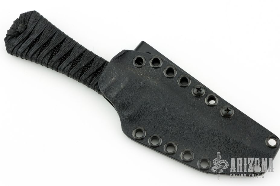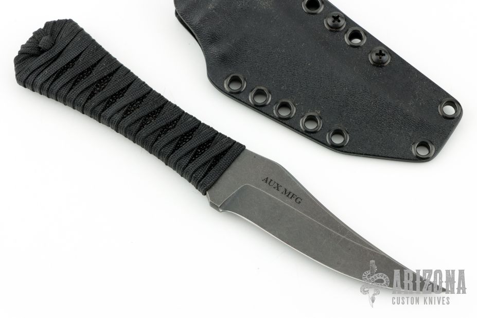 This Pocket Bowie by Auxiliary Manufacturing features an acid tumbled blade with .197" blade stock and 1.170" blade depth. The handle has black ito wrap with stingray underlay. Comes with original box, and Kydex sheath with clip. Excellent condition.