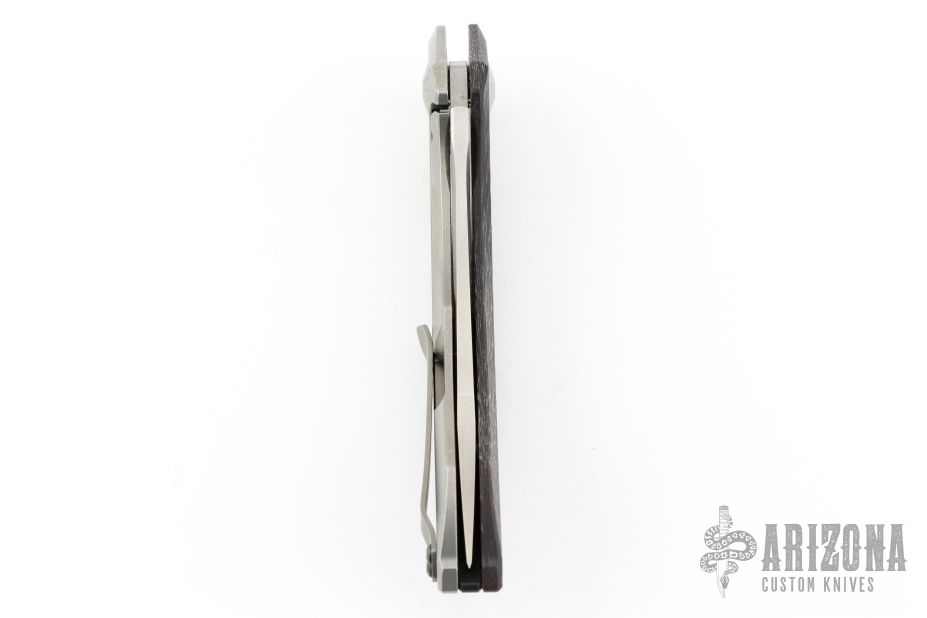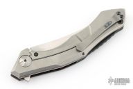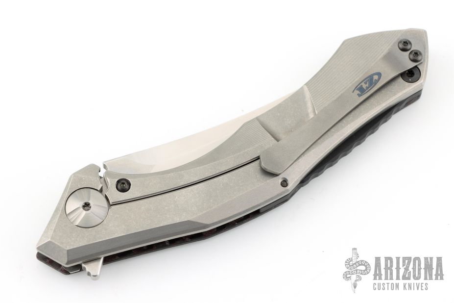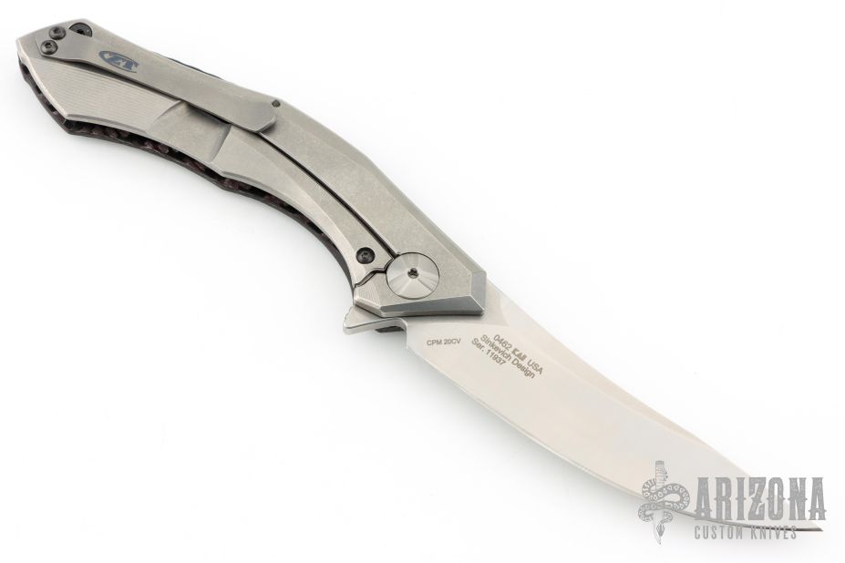 This 0462 Sinkevich Design flipper by Zero Tolerance features a satin finished upswept blade with flipper and swedge. The handle has a red/black carbon fiber and tumbled titanium frame, black aluminum backspacer and a tip up reversible titanium clip. Nice detent, lockup and blade seating, rides on bearings. Has stainless steel lockface insert and overtravel stop, ceramic detent ball. S/N 11937. Excellent Condition. Comes with original box and papers.