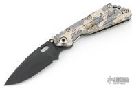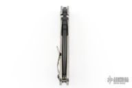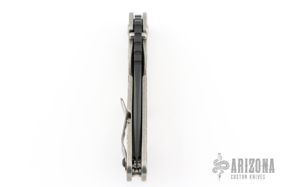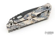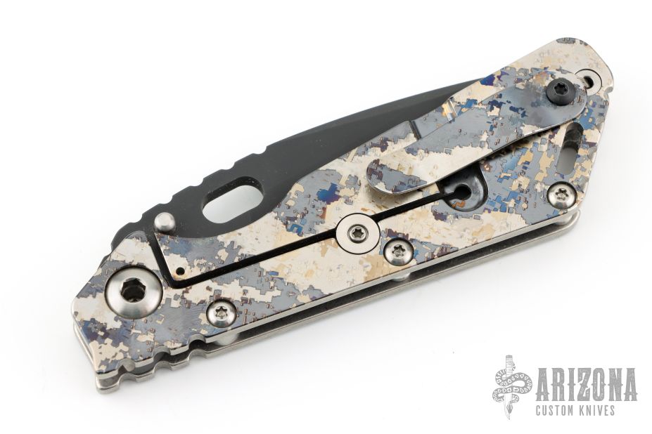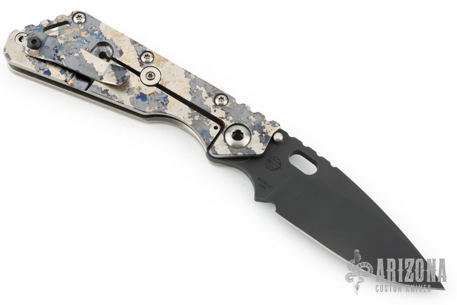 This Mick Strider Performance Series SMF framelock folder features a black spear point blade with thumbhole and notched thumbrest. The handle has a stonewashed and laser engraved titanium frame with titanium clip, tip up carry. Jimping on blade spine. Includes Hinderer "Lock Bar Stabilizer" for maximum reverse lock retention. Nice detent, lockup and blade seating. Excellent condition.