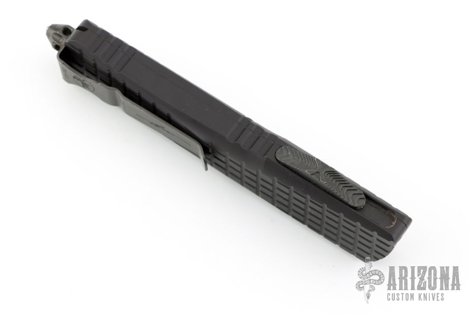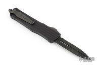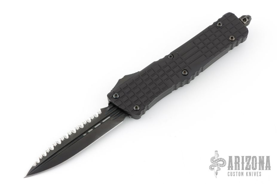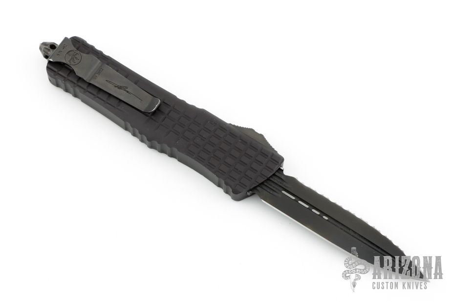 This Combat Troodon OTF automatic by Microtech knives features a fully serrated double edged DLC finished blade. The handle has a DLC frag pattern aluminum handle with black hardware, tip down carry. Glass breaker. Has a couple of light scratches, otherwise excellent condition. #402 and dated 03/2022