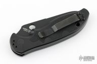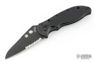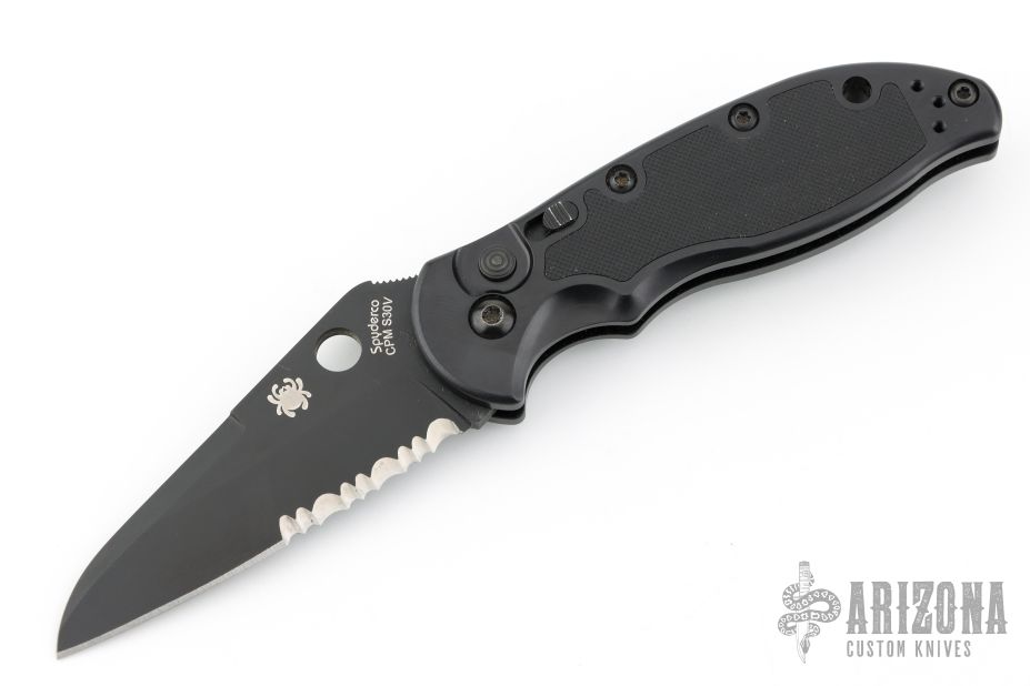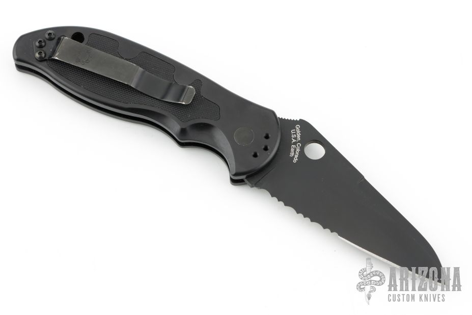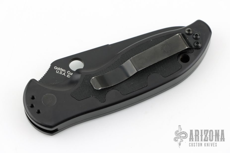 This C121PBK Embassy from Spyderco features a black sheepsfoot partially serrated blade with swedge, small thumbhole and notched thumb ramp. The handle has an aluminum frame with black G10 inlays. Lanyard hole in pommel. Reversible black coated stainless steel tip up clip. Blade is deployed via push button with fast coil spring action. Sliding safety on "A" side of handle. Has a couple light scuffs, otherwise excellent condition.