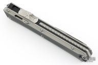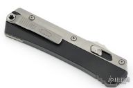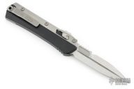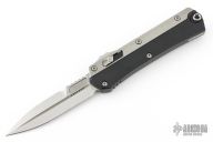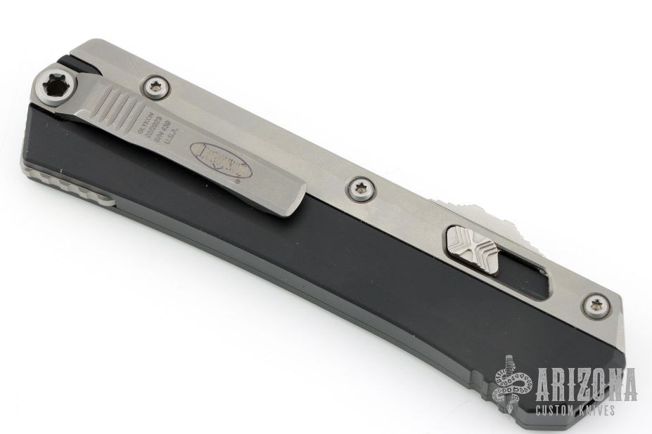 This Glykon by Microtech features a stonewashed double edged blade with fullers and notched thumbrest. The handle has a black aluminum chassis with bead blasted titanium overlays and tip down clip. Comes with original box and papers. Dated 02/2023 and #439. Has a couple scratches, otherwise excellent condition.