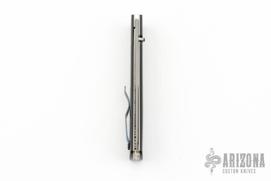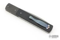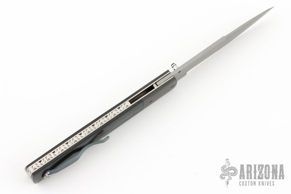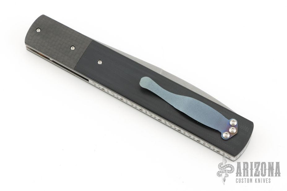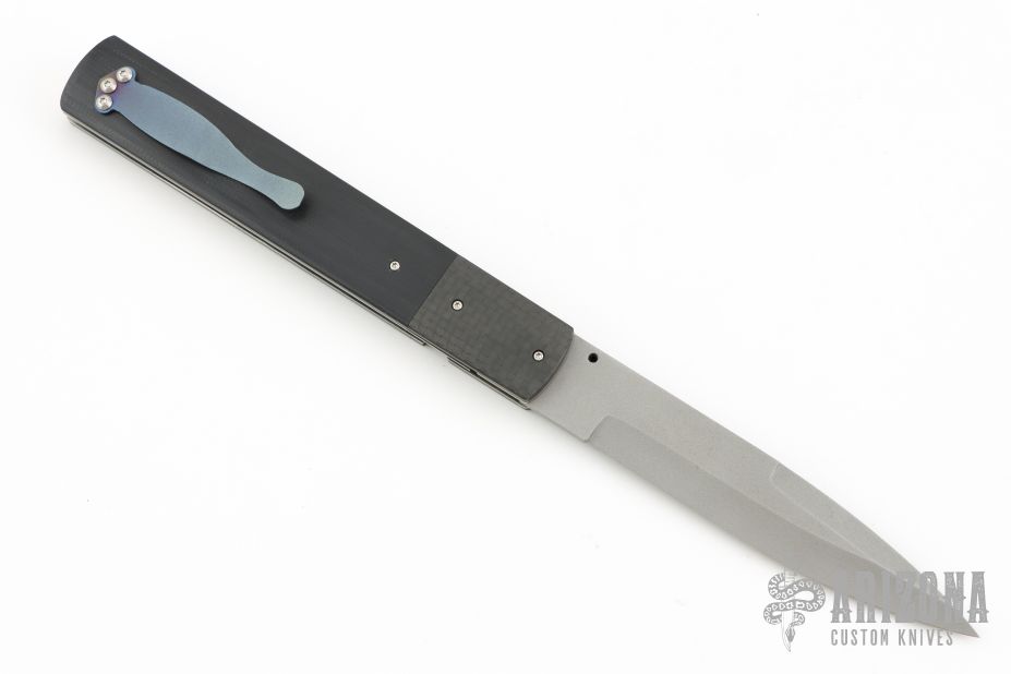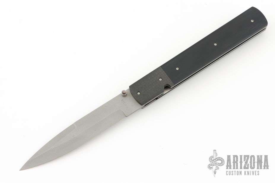 This knife by David Steier features a spear point bead blasted blade with false top edge and a single thumbstud with black lip pearl inlay. The handle has carbon fiber bolsters, black G-10 scales, titanium liners and a fileworked stainless steel backspacer, tip up titanium clip. Nice blade seating, detent and lockup. Comes with zippered case. New from maker!