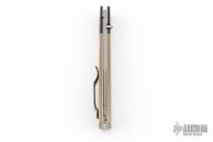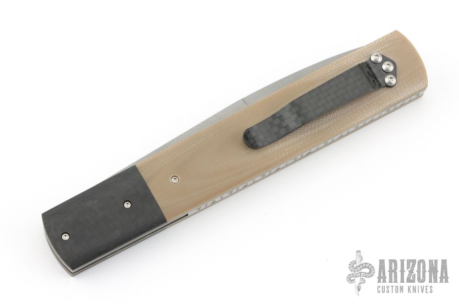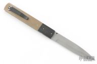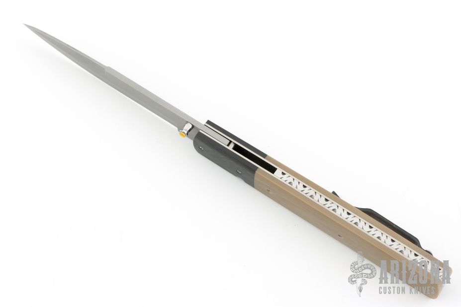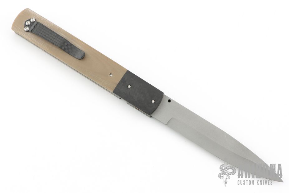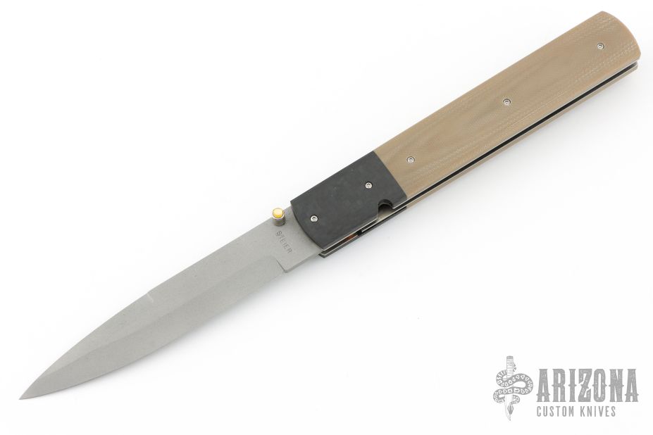 This knife by David Steier features a spear point bead blasted blade with false top edge and a single thumbstud with gold lip pearl inlay. The handle has carbon fiber bolsters, tan G-10 scales, titanium liners and a fileworked stainless steel backspacer, tip up carbon fiber clip. Nice blade seating, detent and lockup. Comes with zippered case. New from maker!